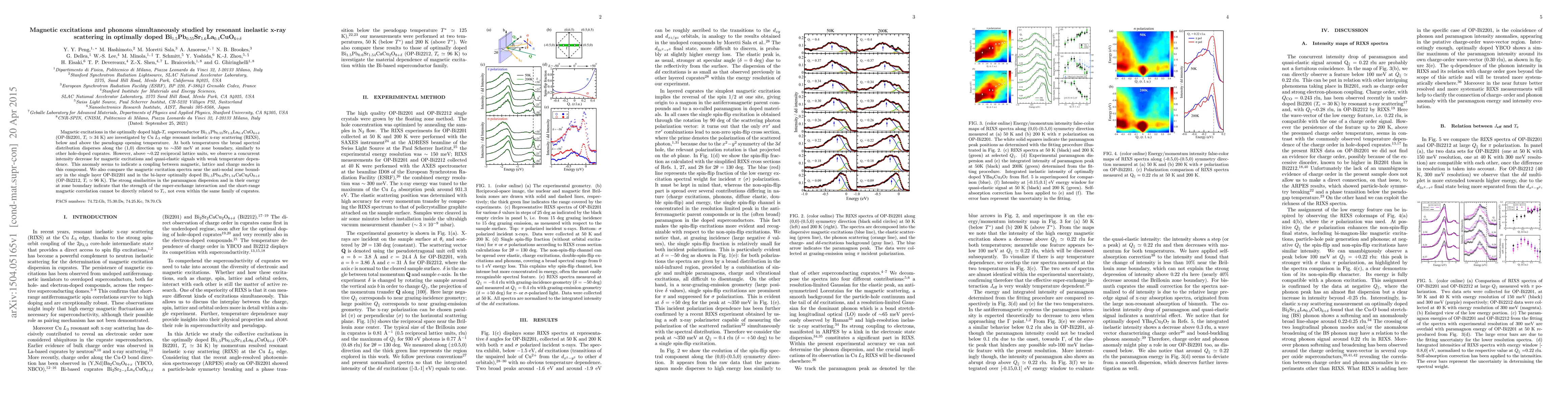 Magnetic excitations in the optimally doped high-$T_\mathrm{c}$ superconductor Bi$_{1.5}$Pb$_{0.55}$Sr$_{1.6}$La$_{0.4}$CuO$_{6+\delta}$ (OP-Bi2201, $T_\mathrm{c}\simeq 34$ K) are investigated by Cu $L_3$ edge resonant inelastic x-ray scattering (RIXS), below and above the pseudogap opening temperature. At both temperatures the broad spectral distribution disperses along the (1,0) direction up to $\sim$350~meV at zone boundary, similarly to other hole-doped cuprates. However, above $\sim$0.22 reciprocal lattice units, we observe a concurrent intensity decrease for magnetic excitations and quasi-elastic signals with weak temperature dependence. This anomaly seems to indicate a coupling between magnetic, lattice and charge modes in this compound. We also compare the magnetic excitation spectra near the anti-nodal zone boundary in the single layer OP-Bi2201 and in the bi-layer optimally doped Bi$_{1.5}$Pb$_{0.6}$Sr$_{1.54}$CaCu$_2$O$_{8+\delta}$ (OP-Bi2212, $T_\mathrm{c}\simeq96$ K). The strong similarities in the paramagnon dispersion and in their energy at zone boundary indicate that the strength of the super-exchange interaction and the short-range magnetic correlation cannot be directly related to $T_\mathrm{c}$, not even within the same family of cuprates.