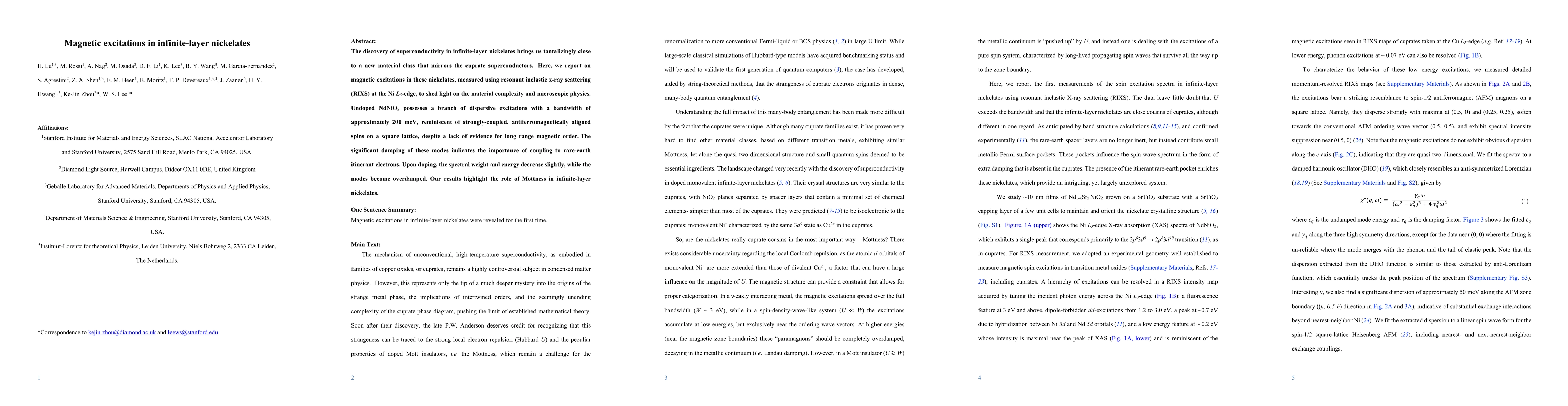 This study investigates magnetic excitations in infinite-layer nickelates using RIXS, revealing dispersive excitations in undoped NdNiO2 akin to antiferromagnetic spins, despite no long-range order. Doping slightly alters these excitations, emphasizing the influence of Mottness and rare-earth electron coupling in the material.