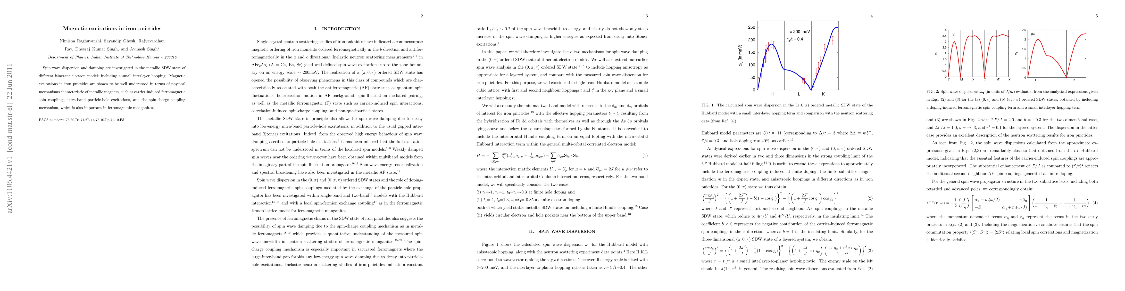 Spin wave dispersion and damping are investigated in the metallic SDW state of different itinerant electron models including a small interlayer hopping. Magnetic excitations in iron pnictides are shown to be well understood in terms of physical mechanisms characteristic of metallic magnets, such as carrier-induced ferromagnetic spin couplings, intra-band particle-hole excitations, and the spin-charge coupling mechanism, which is also important in ferromagnetic manganites.
