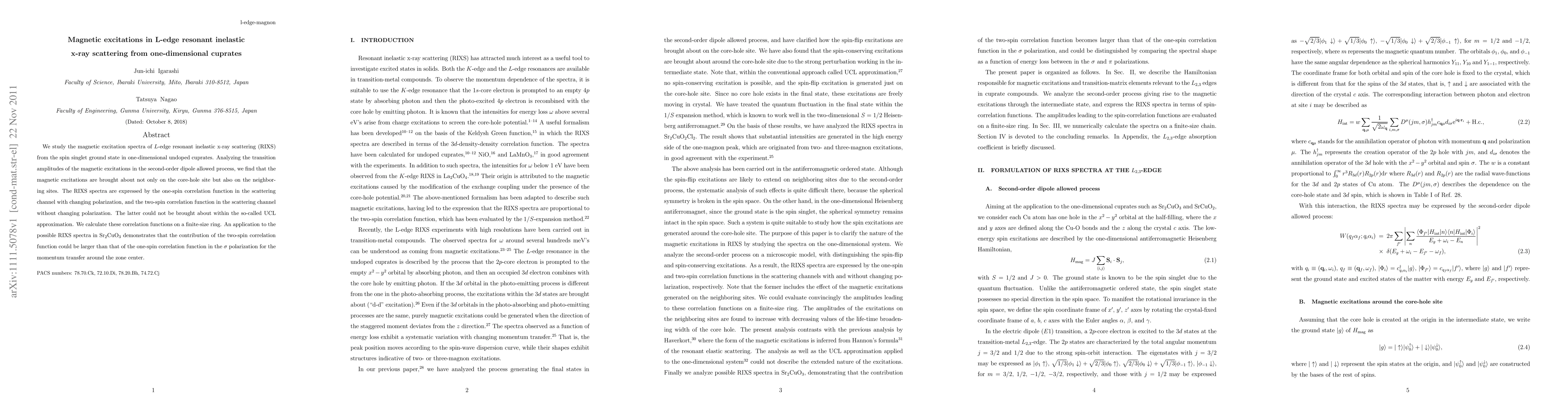 This paper investigates the magnetic excitation spectra in one-dimensional undoped cuprates using L-edge resonant inelastic x-ray scattering (RIXS). It finds that magnetic excitations occur not only on the core-hole site but also on neighboring sites, with significant contributions from two-spin correlation functions not accounted for by the UCL approximation.