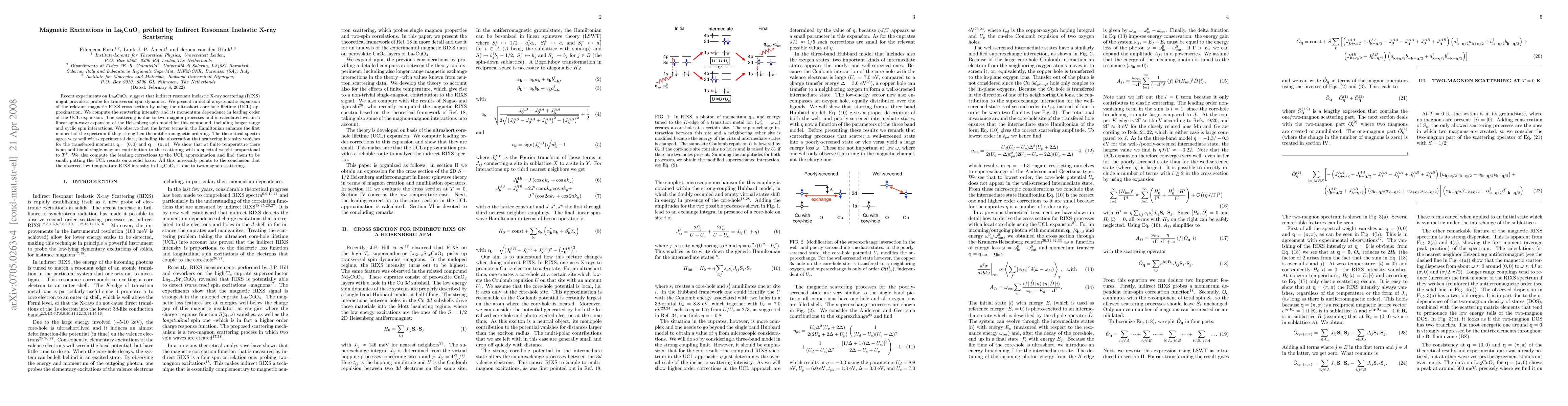 This paper uses indirect resonant inelastic X-ray scattering (RIXS) to probe magnetic excitations in La$_2$CuO$_4$, demonstrating that two-magnon processes dominate the scattering via a UCL approximation. Theoretical spectra match experimental data, showing enhanced antiferromagnetic ordering and a vanishing scattering intensity for specific momenta.