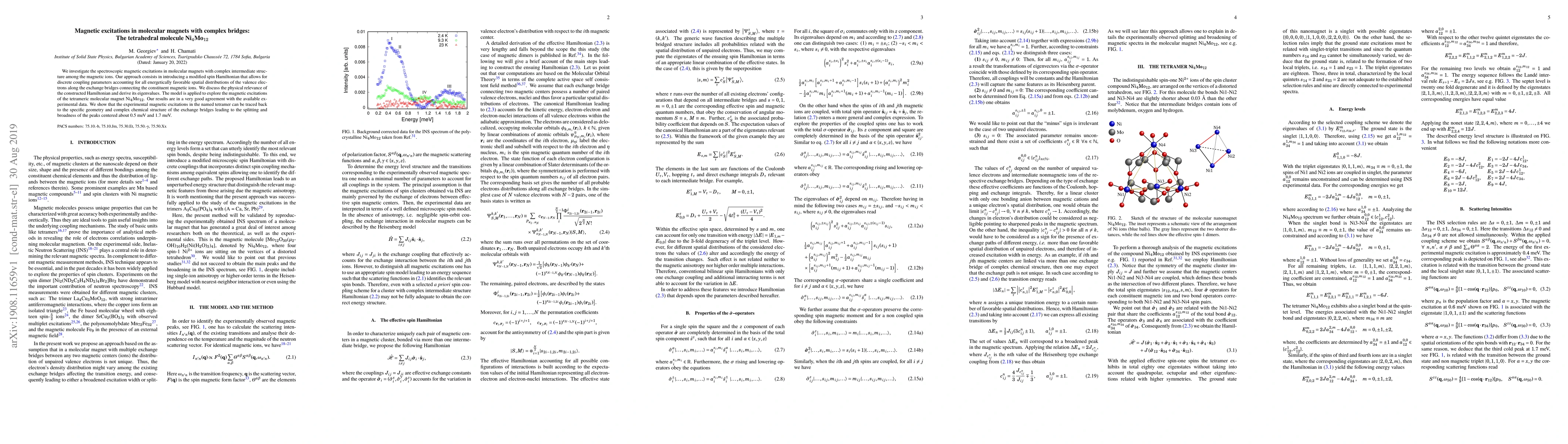 We investigate the spectroscopic magnetic excitations in molecular magnets with complex intermediate structure among the magnetic ions. Our approach consists in introducing a modified spin Hamiltonian that allows for discrete coupling parameters accounting for all energetically favorable spatial distributions of the valence electrons along the exchange bridges connecting the constituent magnetic ions. We discuss the physical relevance of the constructed Hamiltonian and derive its eigenvalues. The model is applied to explore the magnetic excitations of the tetrameric molecular magnet Ni$_4$Mo$_{12}$. Our results are in a very good agreement with the available experimental data. We show that the experimental magnetic excitations in the named tetramer can be traced back to the specific geometry and complex chemical structure of the exchange bridges leading to the splitting and broadness of the peaks centered about 0.5 meV and 1.7 meV.