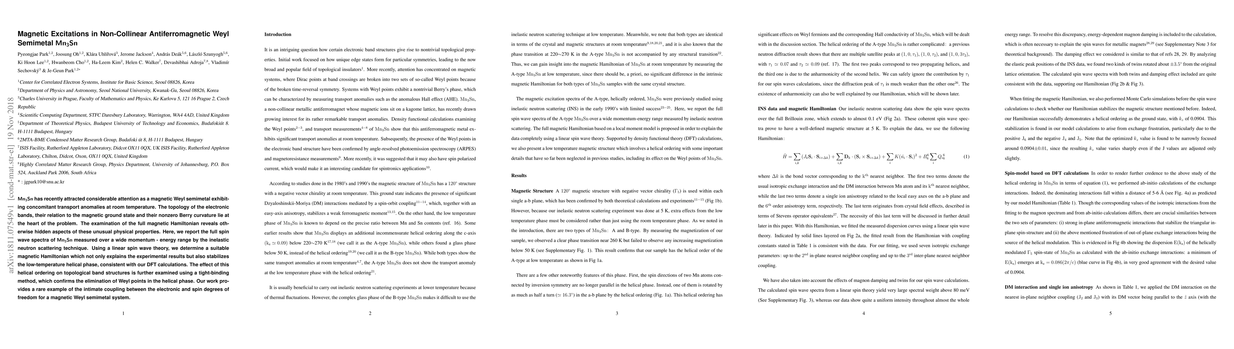 $\mathsf{Mn_{3}Sn}$ has recently attracted considerable attention as a magnetic Weyl semimetal exhibiting concomitant transport anomalies at room temperature. The topology of the electronic bands, their relation to the magnetic ground state and their nonzero Berry curvature lie at the heart of the problem. The examination of the full magnetic Hamiltonian reveals otherwise hidden aspects of these unusual physical properties. Here, we report the full spin wave spectra of $\mathsf{Mn_{3}Sn}$ measured over a wide momentum - energy range by the inelastic neutron scattering technique. Using a linear spin wave theory, we determine a suitable magnetic Hamiltonian which not only explains the experimental results but also stabilizes the low-temperature helical phase, consistent with our DFT calculations. The effect of this helical ordering on topological band structures is further examined using a tight-binding method, which confirms the elimination of Weyl points in the helical phase. Our work provides a rare example of the intimate coupling between the electronic and spin degrees of freedom for a magnetic Weyl semimetal system.