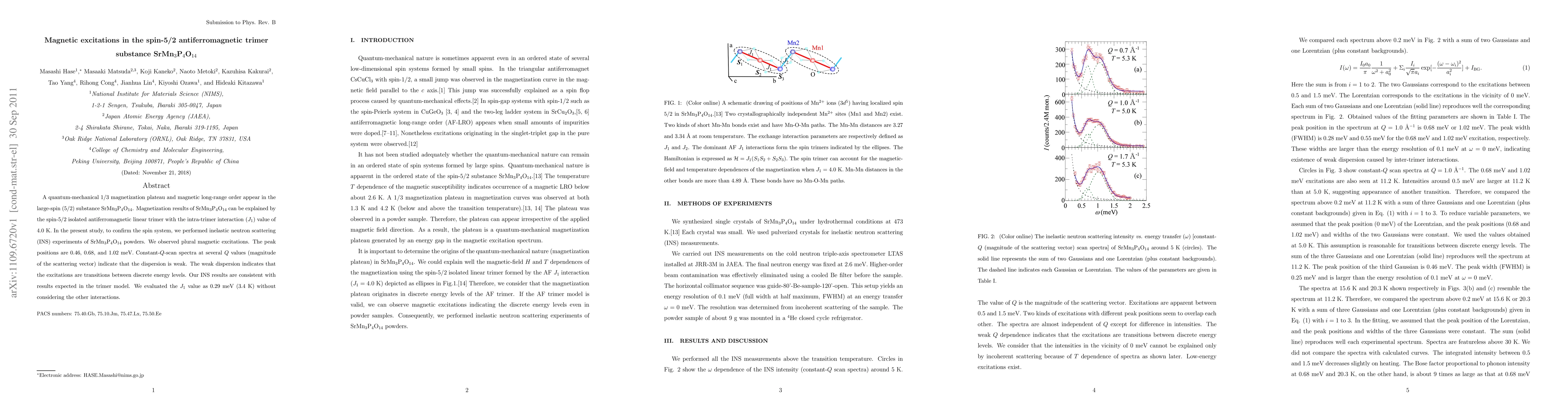 The study investigates the magnetic behavior of SrMn3P4O14, confirming its spin-5/2 antiferromagnetic trimer system. Inelastic neutron scattering (INS) experiments reveal discrete magnetic excitations at 0.46, 0.68, and 1.02 meV, with weak dispersion, supporting the trimer model. The intra-trimer interaction (J1) is estimated as 0.29 meV (3.4 K).