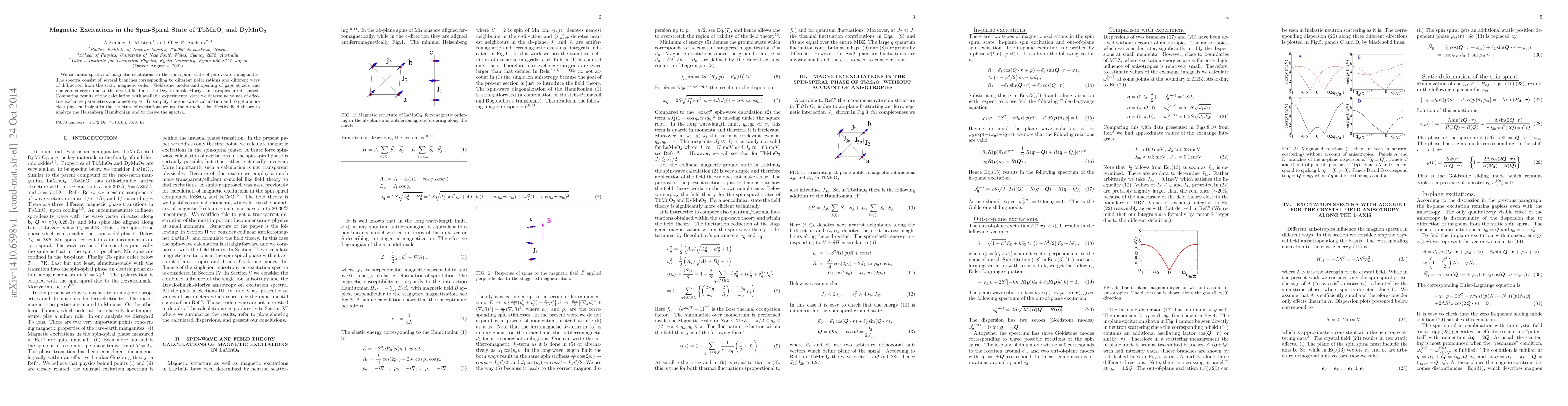 We calculate spectra of magnetic excitations in the spin-spiral state of perovskite manganates. The spectra consist of several branches corresponding to different polarizations and different ways of diffraction from the static magnetic order. Goldstone modes and opening of gaps at zero and non-zero energies due to the crystal field and the Dzyaloshinski-Moriya anisotropies are discussed. Comparing results of the calculation with available experimental data we determine values of effective exchange parameters and anisotropies. To simplify the spin-wave calculation and to get a more clear physical insight in the structure of excitations we use the {\sigma}-model-like effective field theory to analyze the Heisenberg Hamiltonian and to derive the spectra.