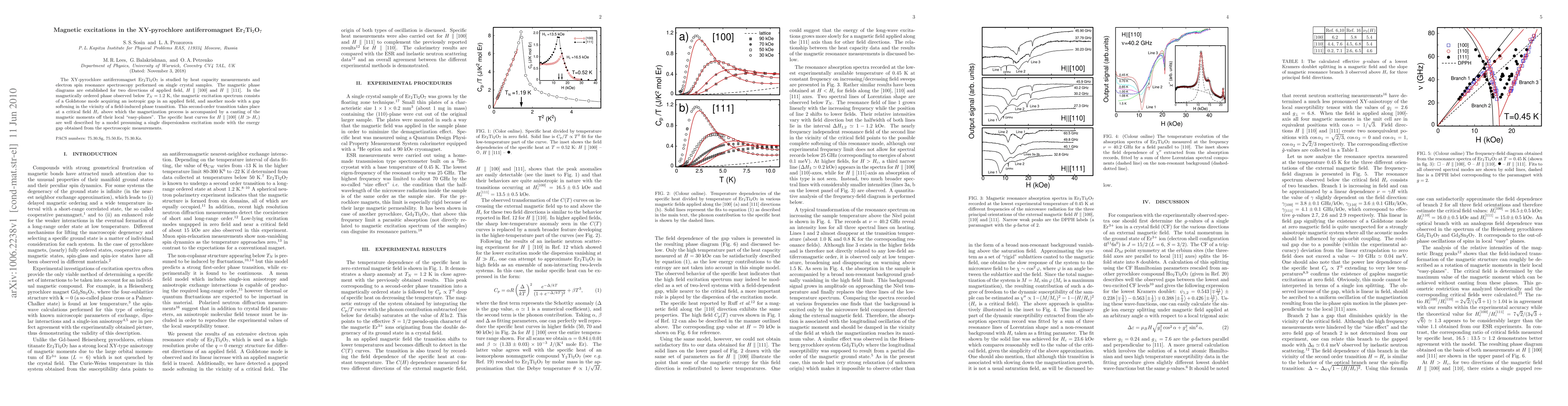 The XY-pyrochlore antiferromagnet \ETO\ is studied by heat capacity measurements and electron spin resonance spectroscopy performed on single crystal samples. The magnetic phase diagrams are established for two directions of applied field, $H\parallel [100]$ and $H\parallel [111]$. In the magnetically ordered phase observed below $T_N=1.2$ K, the magnetic excitation spectrum consists of a Goldstone mode acquiring an isotropic gap in an applied field, and another mode with a gap softening in the vicinity of a field-induced phase transition. This second-order transition takes place at a critical field $H_c$ above which the magnetization process is accompanied by a canting of the magnetic moments off their local "easy-planes". The specific heat curves for $H\parallel [100]$ ($H\gg H_c$) are well described by a model presuming a single dispersionless excitation mode with the energy gap obtained from the spectroscopic measurements.