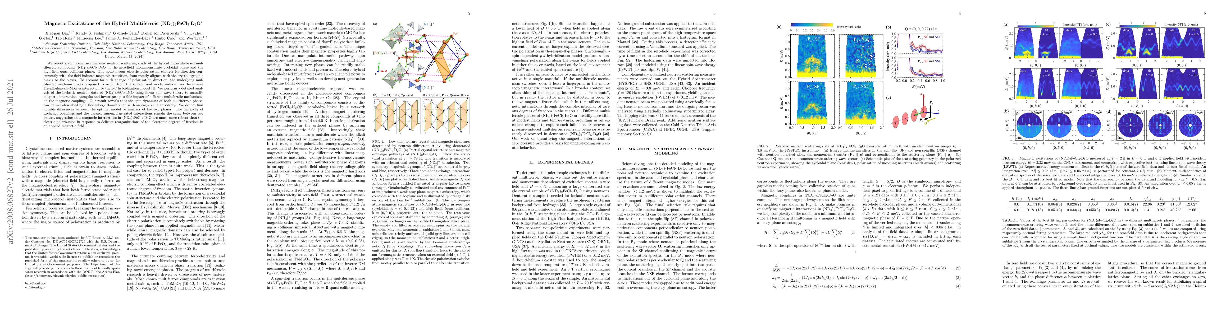 We report a comprehensive inelastic neutron scattering study of the hybrid molecule-based multiferroic compound (ND4)2FeCl5D2O in the zero-field incommensurate cycloidal phase and the high-field quasi-collinear phase. The spontaneous electric polarization changes its direction concurrently with the field-induced magnetic transition, from mostly aligned with the crystallographic a-axis to the c-axis. To account for such change of polarization direction, the underlying multiferroic mechanism was proposed to switch from the spin-current model induced via the inverse Dzyalloshinskii-Moriya interaction to the p-d hybridization model. We perform a detailed analysis of the inelastic neutron data of (ND4)2FeCl5D2O using linear spin-wave theory to quantify magnetic interaction strengths and investigate possible impact of different multiferroic mechanisms on the magnetic couplings. Our result reveals that the spin dynamics of both multiferroic phases can be well-described by a Heisenberg Hamiltonian with an easy-plane anisotropy. We do not find notable differences between the optimal model parameters of the two phases. The hierarchy of exchange couplings and the balance among frustrated interactions remain the same between two phases, suggesting that magnetic interactions in (ND4)2FeCl5D2O are much more robust than the electric polarization in response to delicate reorganizations of the electronic degrees of freedom in an applied magnetic field.