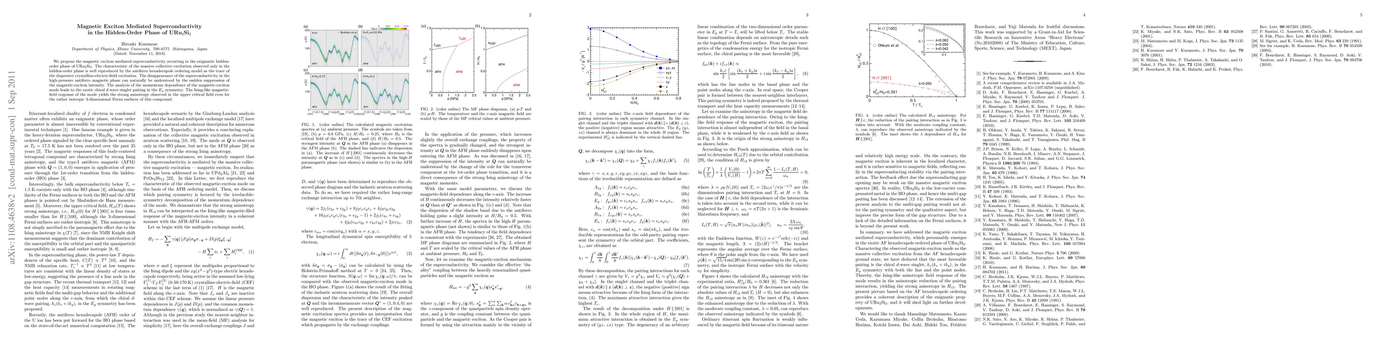 This research proposes that superconductivity in URu2Si2's hidden-order phase is mediated by magnetic excitons, with the suppression of this superconductivity under high pressure explained by the reduction of magnetic-exciton intensity. The study reveals an exotic chiral d-wave pairing and strong anisotropy in the compound's upper critical field.