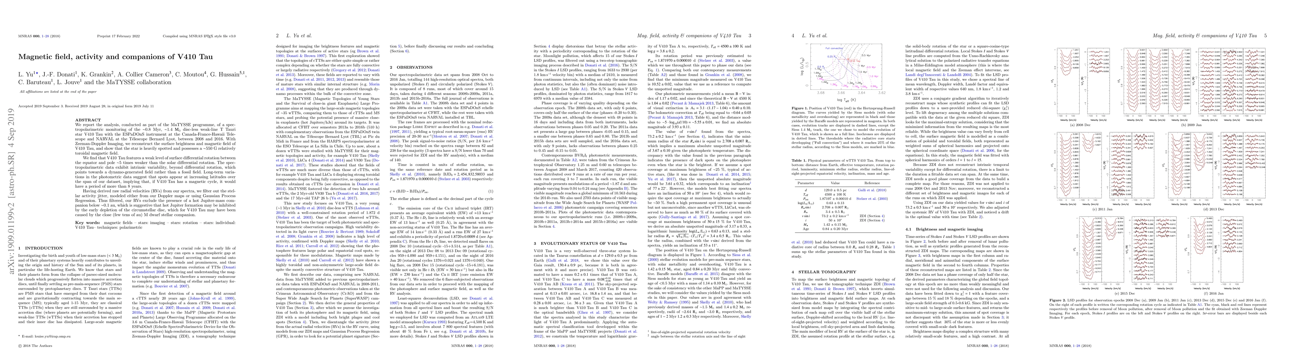 The research analyzes the magnetic field and activity of the young T Tauri star V410 Tau using spectropolarimetric observations. It reveals a heavily spotted surface with a toroidal magnetic field of ~550 G and weak differential rotation. The study also suggests that V410 Tau might have a magnetic cycle longer than 8 years and indicates that early disc depletion, possibly due to a close M dwarf companion, may inhibit hot Jupiter formation around such stars.