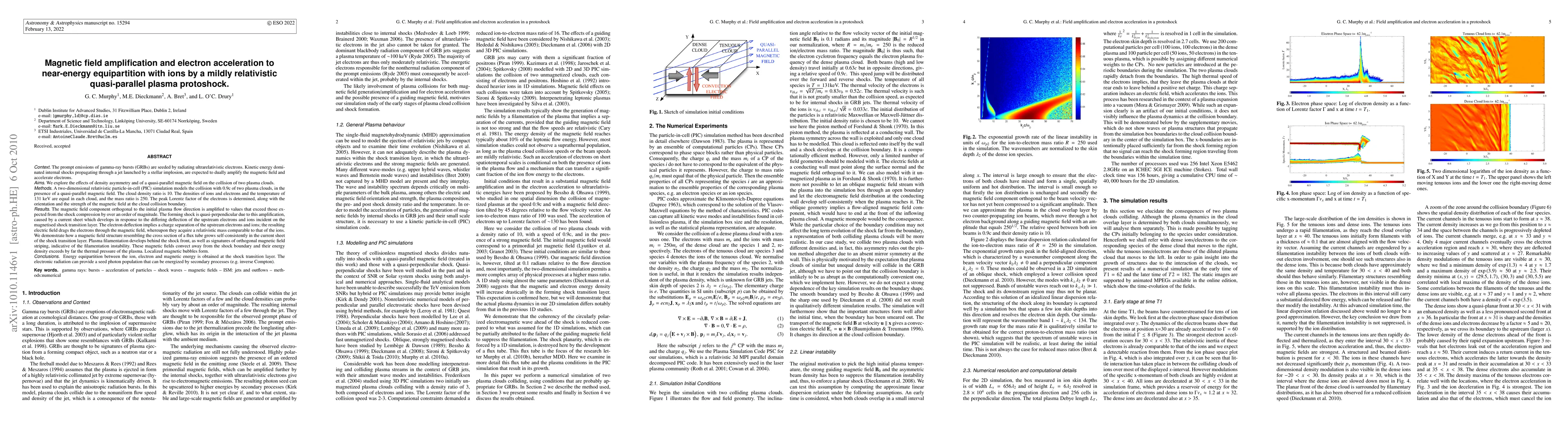 The prompt emissions of gamma-ray bursts are seeded by radiating ultrarelativistic electrons. Internal shocks propagating through a jet launched by a stellar implosion, are expected to amplify the magnetic field & accelerate electrons. We explore the effects of density asymmetry & a quasi-parallel magnetic field on the collision of plasma clouds. A 2D relativistic PIC simulation models the collision of two plasma clouds, in the presence of a quasi-parallel magnetic field. The cloud density ratio is 10. The densities of ions & electrons & the temperature of 131 keV are equal in each cloud. The mass ratio is 250. The peak Lorentz factor of the electrons is determined, along with the orientation & strength of the magnetic field at the cloud collision boundary. The magnetic field component orthogonal to the initial plasma flow direction is amplified to values that exceed those expected from shock compression by over an order of magnitude. The forming shock is quasi-perpendicular due to this amplification, caused by a current sheet which develops in response to the differing deflection of the incoming upstream electrons & ions. The electron deflection implies a charge separation of the upstream electrons & ions; the resulting electric field drags the electrons through the magnetic field, whereupon they acquire a relativistic mass comparable to the ions. We demonstrate how a magnetic field structure resembling the cross section of a flux tube grows in the current sheet of the shock transition layer. Plasma filamentation develops, as well as signatures of orthogonal magnetic field striping. Localized magnetic bubbles form. Energy equipartition between the ion, electron & magnetic energy is obtained at the shock transition layer. The electronic radiation can provide a seed photon population that can be energized by secondary processes (e.g. inverse Compton).