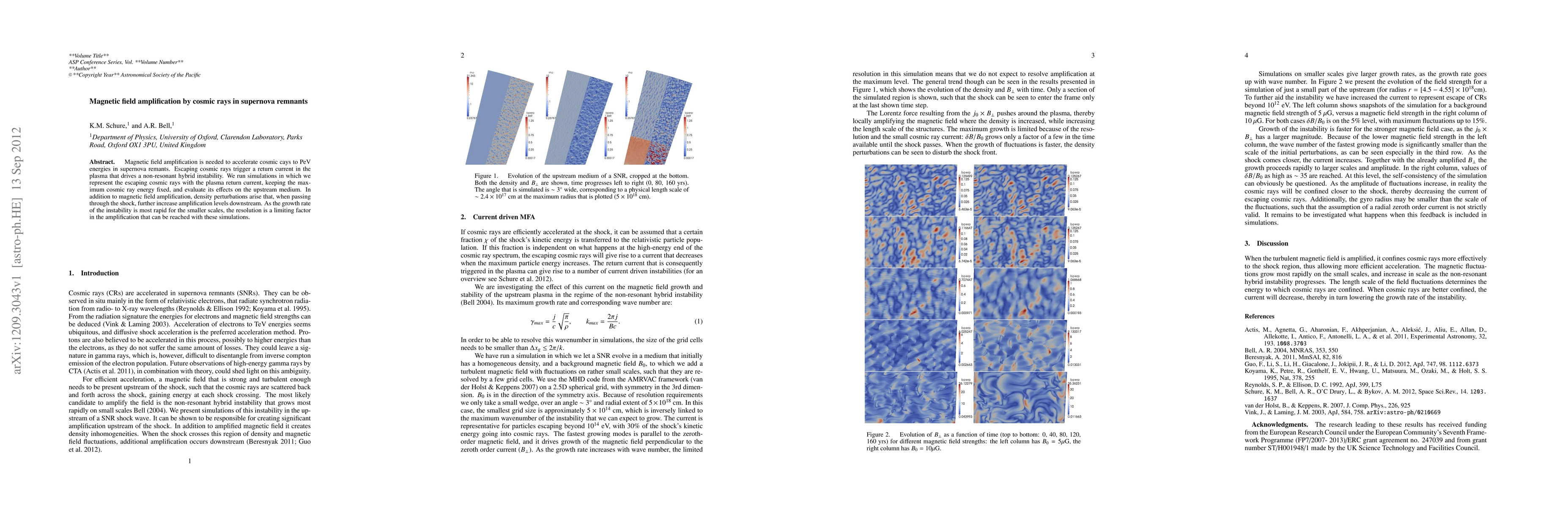 This paper investigates magnetic field amplification in supernova remnants driven by cosmic rays, showing that a return current from escaping cosmic rays triggers a non-resonant hybrid instability. The simulations reveal that this process not only amplifies magnetic fields but also generates density perturbations that further enhance downstream amplification, though resolution limits the extent of this effect.