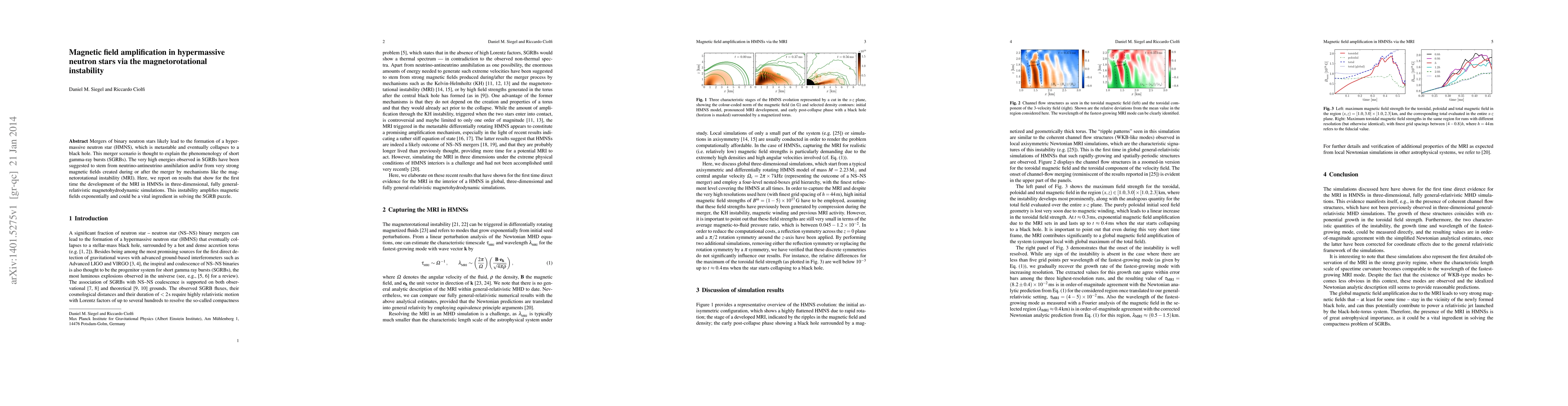This paper reports the first three-dimensional, fully general-relativistic magnetohydrodynamic simulations of hypermassive neutron stars (HMNSs) showing the development of the magnetorotational instability (MRI). The MRI amplifies magnetic fields exponentially, potentially providing a mechanism for the high energies observed in short gamma-ray bursts.