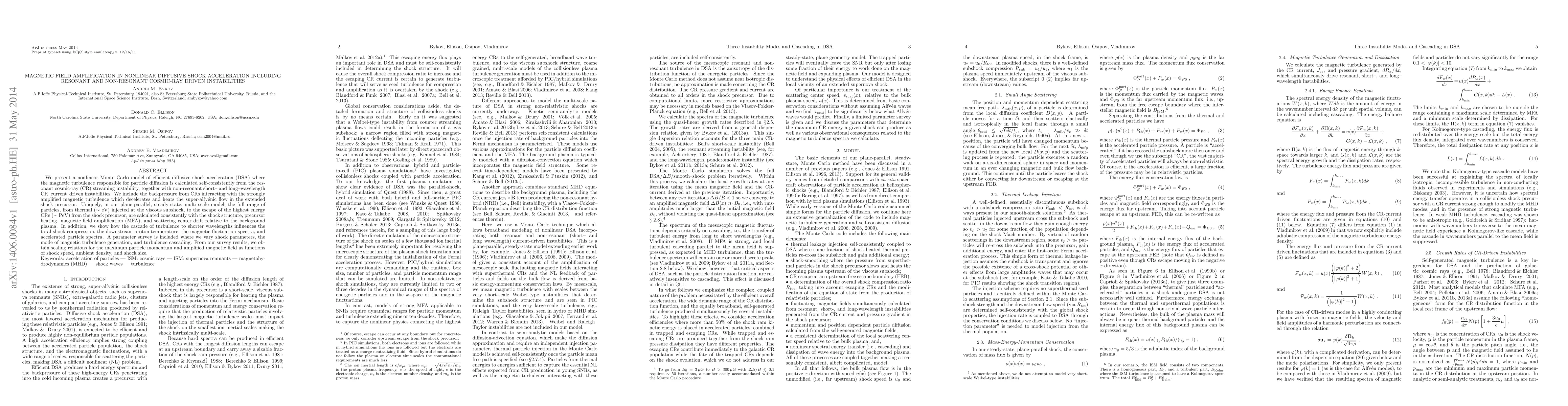This paper presents a nonlinear Monte Carlo model for diffusive shock acceleration, incorporating self-consistent magnetic turbulence from cosmic-ray instabilities, and explores the impact on magnetic field amplification and particle acceleration, deriving scaling relations for maximum particle energy and amplified magnetic fields.