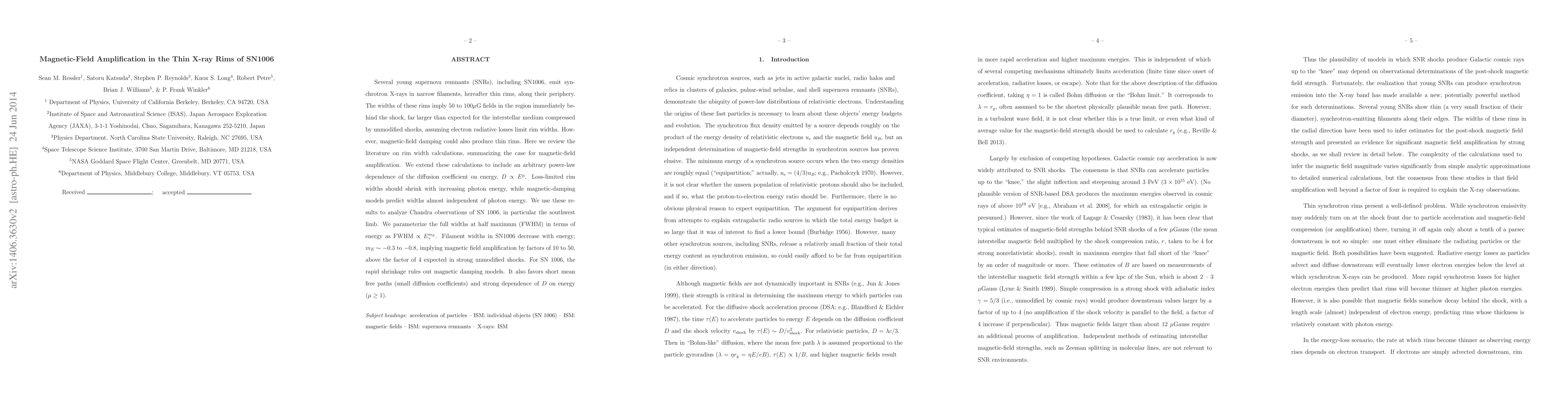 This paper investigates magnetic-field amplification in the thin X-ray rims of SN1006, finding that the observed rim widths decrease with increasing photon energy, indicating magnetic field amplification by factors of 10 to 50. This rules out magnetic damping models and supports short mean free paths and strong energy dependence of diffusion coefficients.