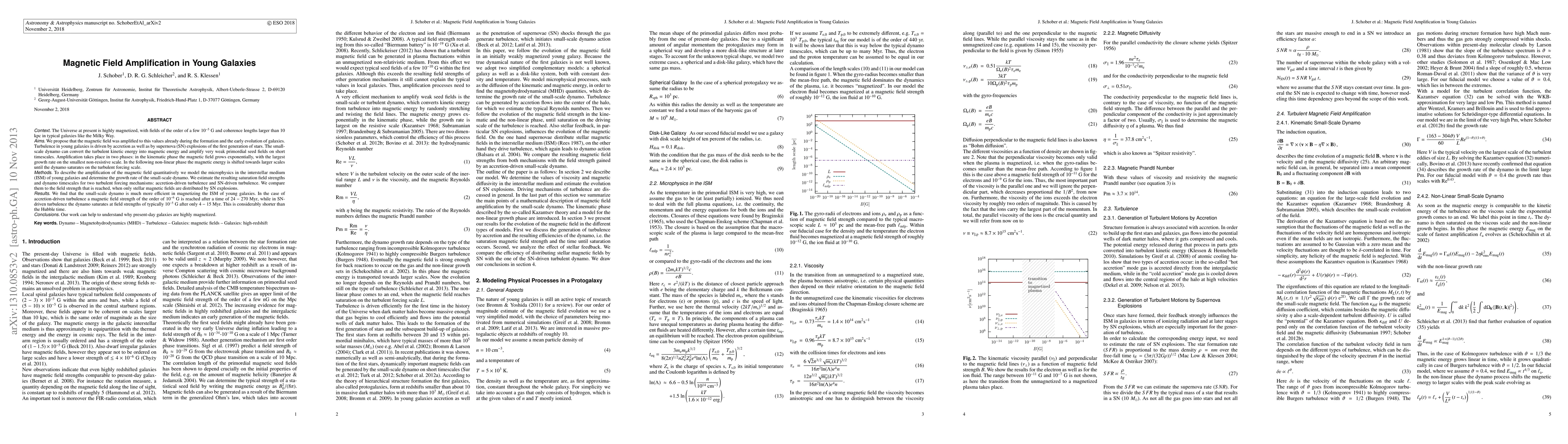 This paper investigates the mechanisms behind the amplification of magnetic fields in young galaxies, proposing that turbulence driven by accretion and supernova explosions can efficiently convert kinetic energy to magnetic energy. The small-scale dynamo mechanism is shown to significantly amplify primordial magnetic fields within a few tens of millions of years, much faster than previously thought.