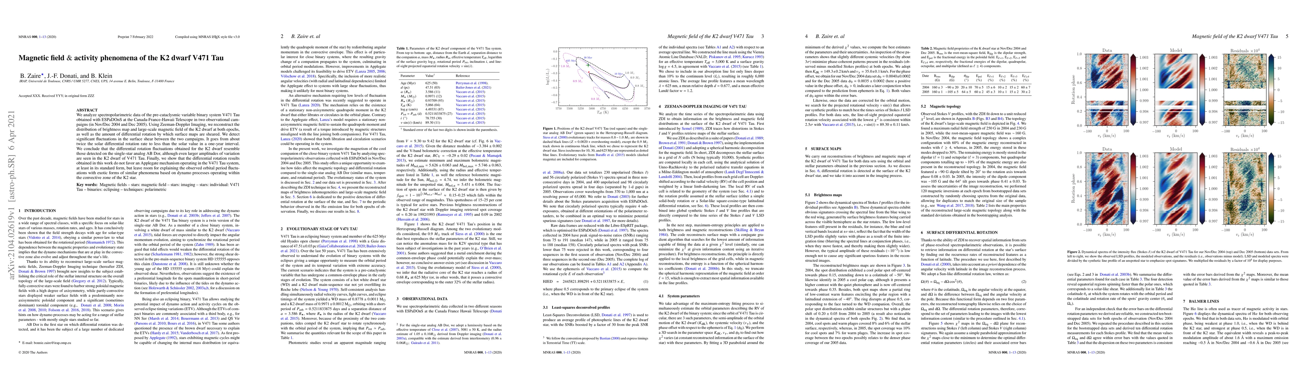 This study uses spectropolarimetric data to analyze the magnetic field and activity of the K2 dwarf V471 Tau, revealing significant fluctuations in differential rotation over a year, and suggests that standard Applegate mechanisms are unlikely, but exotic dynamo processes may explain observed orbital period variations.