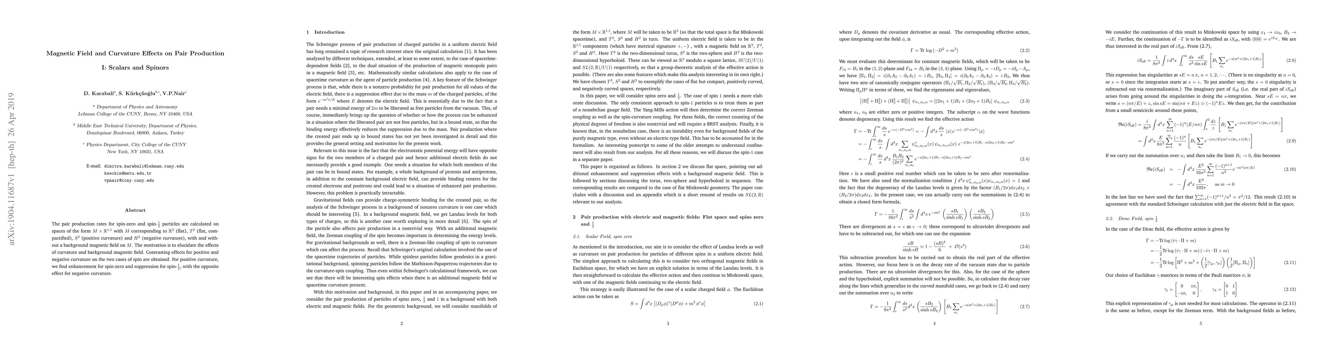The pair production rates for spin-zero and spin-$\frac{1}{2}$ particles are calculated on spaces of the form $M \times {\mathbb R}^{1,1}$ with $M$ corresponding to ${\mathbb R}^2$ (flat), $T^2$ (flat, compactified), $S^2$ (positive curvature) and $H^2$ (negative curvature), with and without a background magnetic field on $M$. The motivation is to elucidate the effects of curvature and background magnetic field. Contrasting effects for positive and negative curvature on the two cases of spin are obtained. For positive curvature, we find enhancement for spin-zero and suppression for spin-$\frac{1}{2}$, with the opposite effect for negative curvature.
