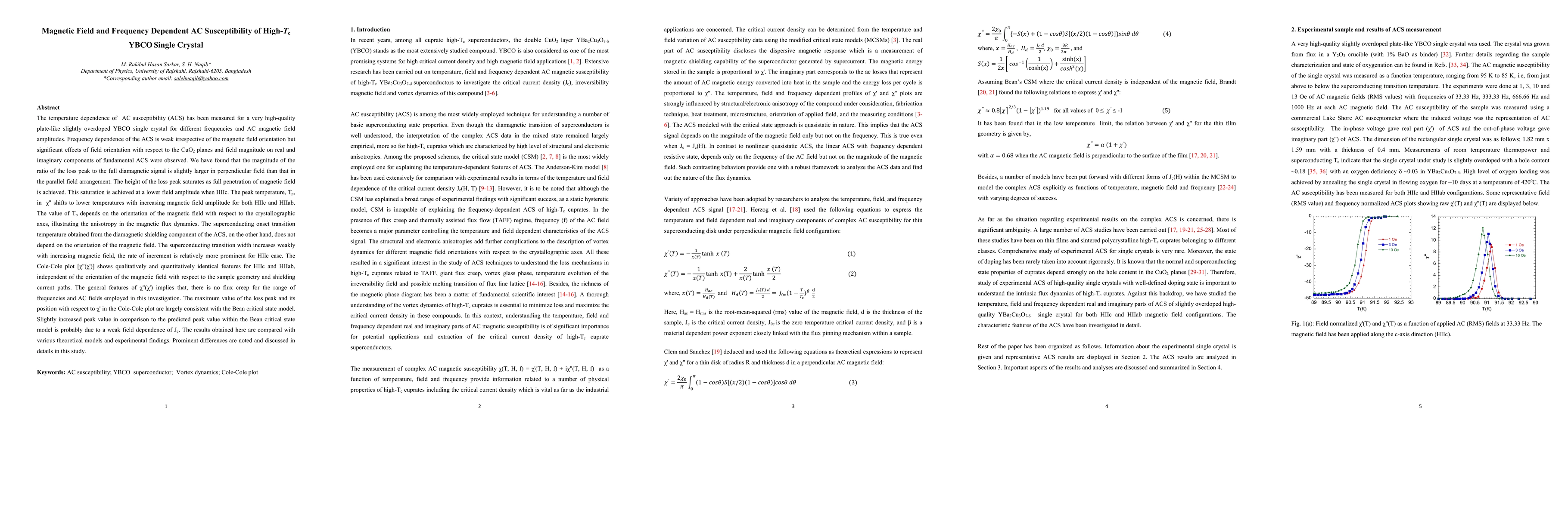 This study examines the AC susceptibility of a high-quality YBCO single crystal under varying frequencies and magnetic field amplitudes. Key findings include weak frequency dependence, significant field orientation effects, saturation of loss peak with full field penetration, and consistent Cole-Cole plot features suggesting no flux creep in the tested range. The results are compared to theoretical models, highlighting prominent differences.