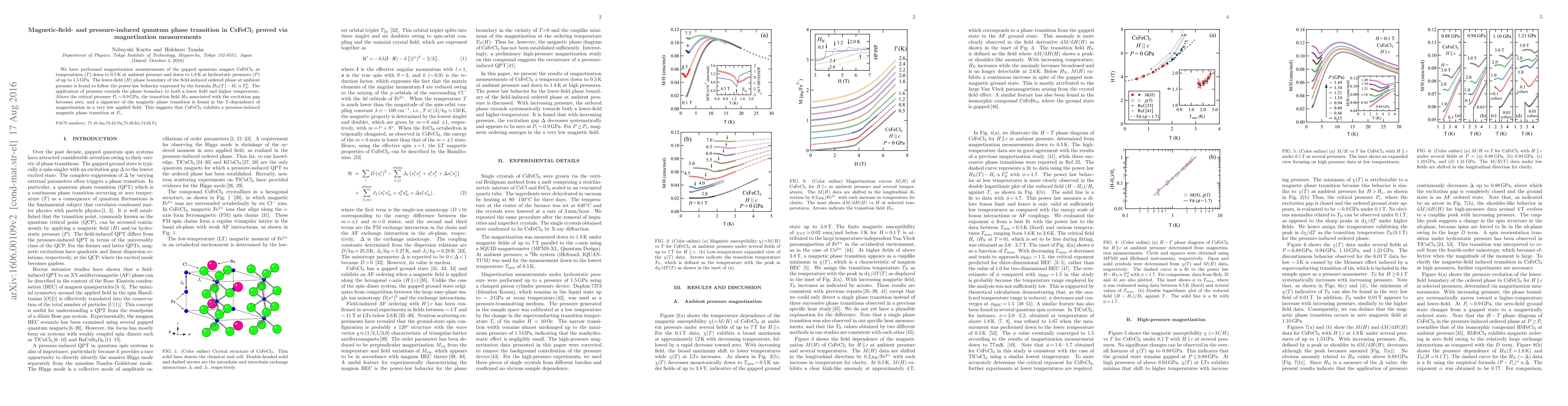 We have performed magnetization measurements of the gapped quantum magnet CsFeCl$_3$ at temperatures ($T$) down to 0.5\,K at ambient pressure and down to 1.8\,K at hydrostatic pressures ($P$) of up to 1.5\,GPa. The lower-field ($H$) phase boundary of the field-induced ordered phase at ambient pressure is found to follow the power-law behavior expressed by the formula $H_{\rm N}(T)$\,$-$\,$H_{\rm c}$\,$\propto$\,$T_{\rm N}^{\phi}$. The application of pressure extends the phase boundary to both a lower field and higher temperature. Above the critical pressure $P_{\rm c}$\,$\sim$\,0.9\,GPa, the transition field $H_{\rm N}$ associated with the excitation gap becomes zero, and a signature of the magnetic phase transition is found in the $T$-dependence of magnetization in a very low applied field. This suggests that CsFeCl$_3$ exhibits a pressure-induced magnetic phase transition at $P_{\rm c}$.