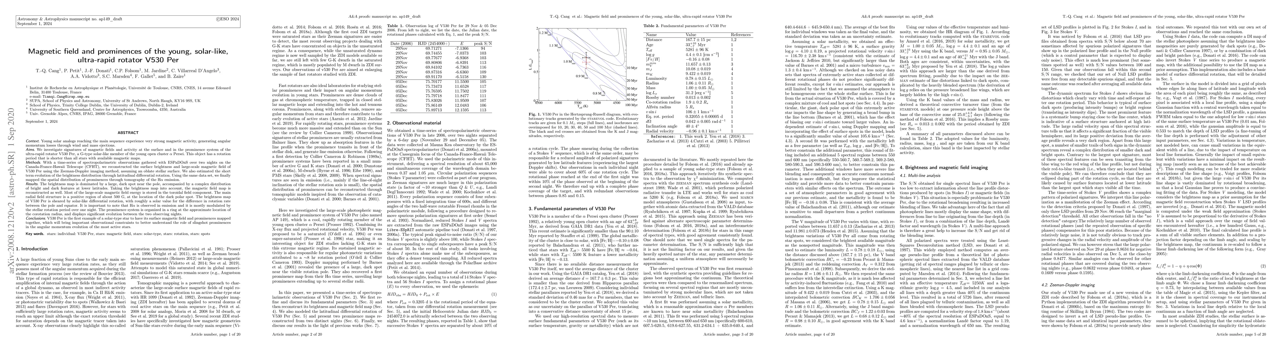 This study investigates V530 Per, an ultra-rapidly rotating solar-like star in the open cluster α Persei. Using spectropolarimetric observations, researchers mapped the star's surface brightness, magnetic field, and prominence system. The results show a large dark polar spot, complex lower-latitude brightness features, dominant toroidal magnetic field, and a prominence ring at the co-rotation radius. V530 Per is the first solar-type star with simultaneous mapping of its magnetic field and prominences, providing crucial data for understanding angular momentum evolution in active stars.