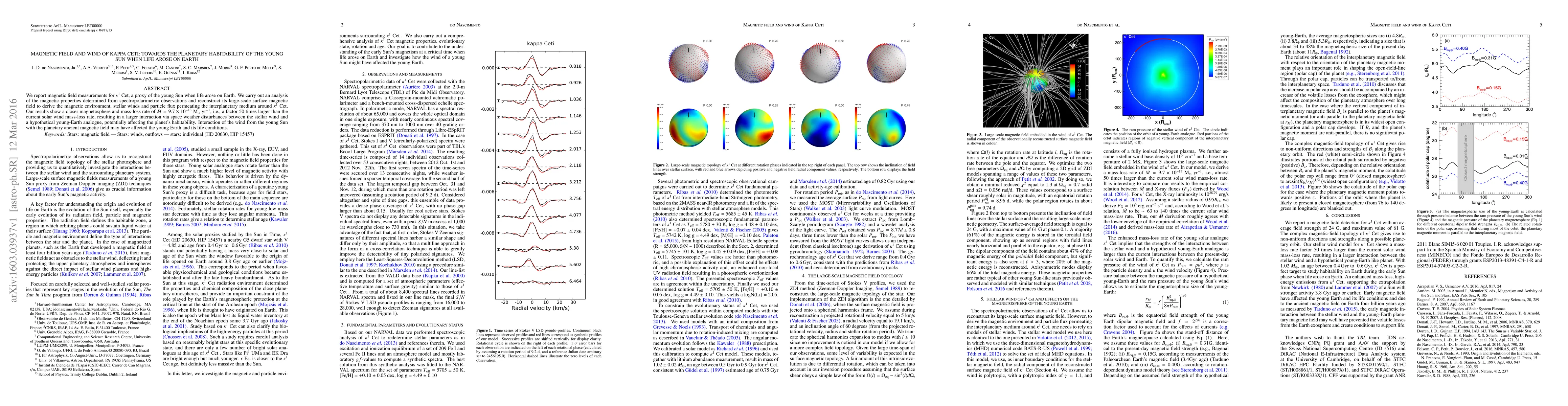 We report magnetic field measurements for Kappa1~Cet, a proxy of the young Sun when life arose on Earth. We carry out an analysis of the magnetic properties determined from spectropolarimetric observations and reconstruct its large-scale surface magnetic field to derive the magnetic environment, stellar winds and particle flux permeating the interplanetary medium around Kappa1~Cet. Our results show a closer magnetosphere and mass-loss rate of Mdot = 9.7 x 10^{-13} Msol/yr, i.e., a factor 50 times larger than the current solar wind mass-loss rate, resulting in a larger interaction via space weather disturbances between the stellar wind and a hypothetical young-Earth analogue, potentially affecting the planet's habitability. Interaction of the wind from the young Sun with the planetary ancient magnetic field may have affected the young Earth and its life conditions