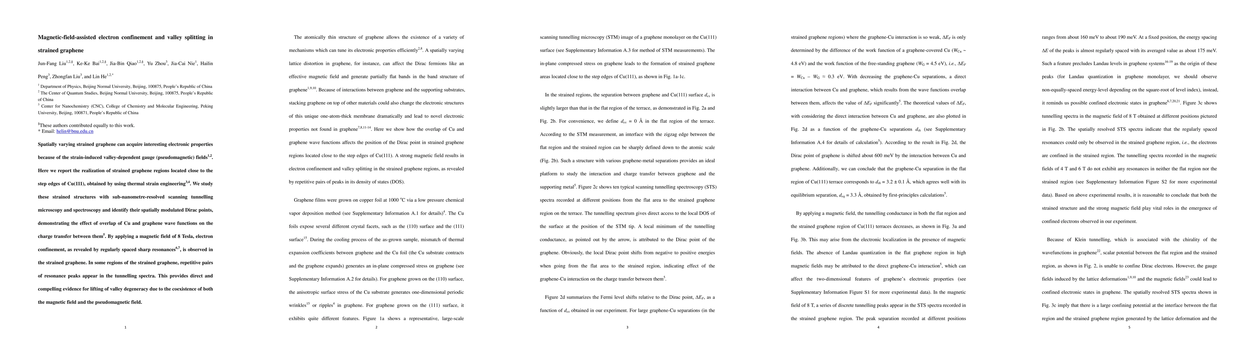 Title: Magnetic-field-assisted electron confinement and valley splitting in strained graphene. Summary: Strained graphene near Cu(111) step edges exhibits modulated Dirac points and valley-dependent pseudomagnetic fields. Magnetic fields induce electron confinement and valley splitting, evidenced by regular resonance peaks in scanning tunnelling spectroscopy.