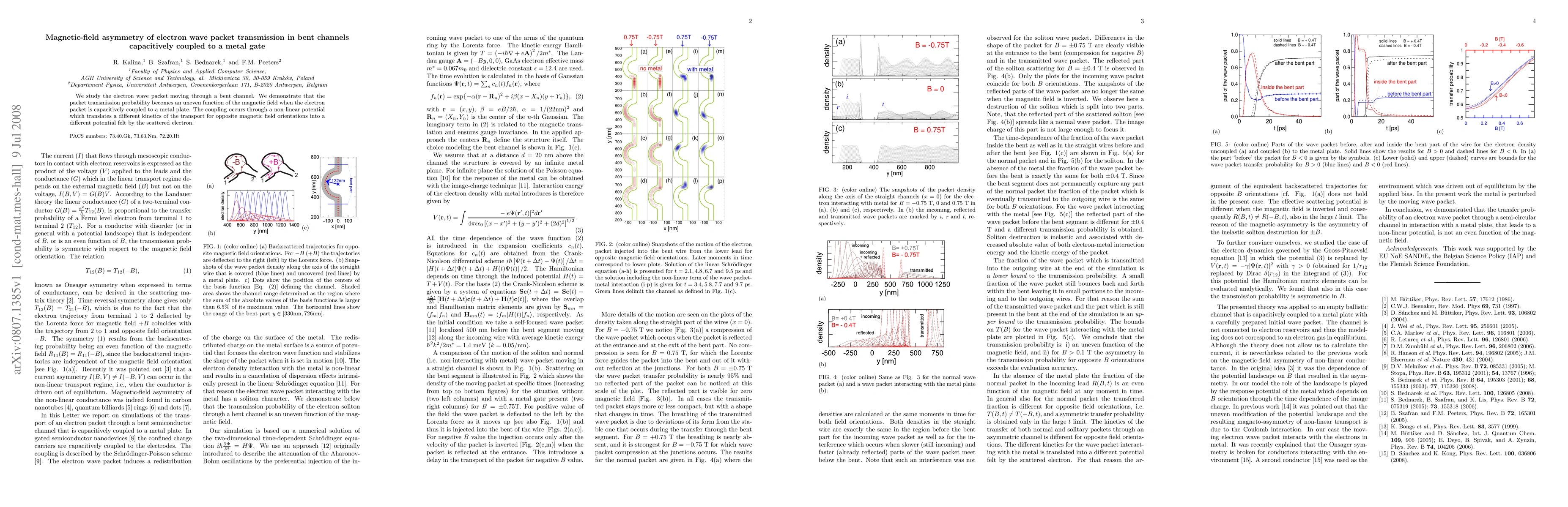This research investigates the transmission of electron wave packets through bent channels influenced by magnetic fields, revealing asymmetric transmission probabilities due to capacitive coupling to a metal gate, which modifies the potential experienced by the electrons. The non-linear coupling results in distinct transport dynamics for opposite magnetic field directions.