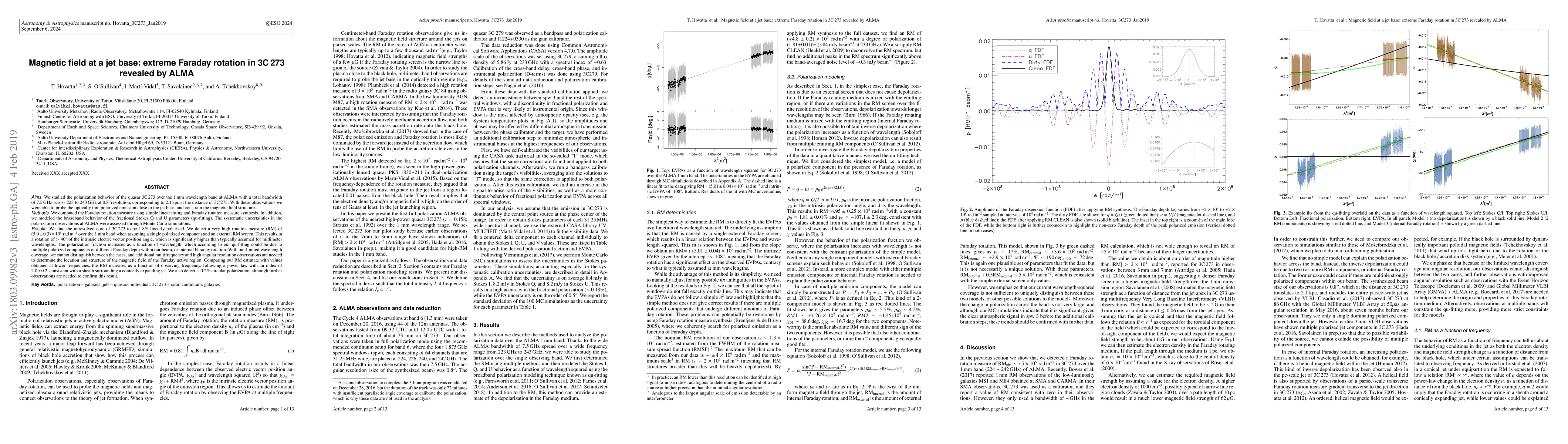 This study using ALMA reveals extreme Faraday rotation in the quasar 3C 273, detecting a high rotation measure of ~5.0 x 10^5 rad/m^2, indicating significant magnetic field influence near the jet base. The polarization fraction increases with wavelength, suggesting multiple polarized components or internal Faraday rotation, necessitating further multifrequency observations for precise magnetic field structure determination.