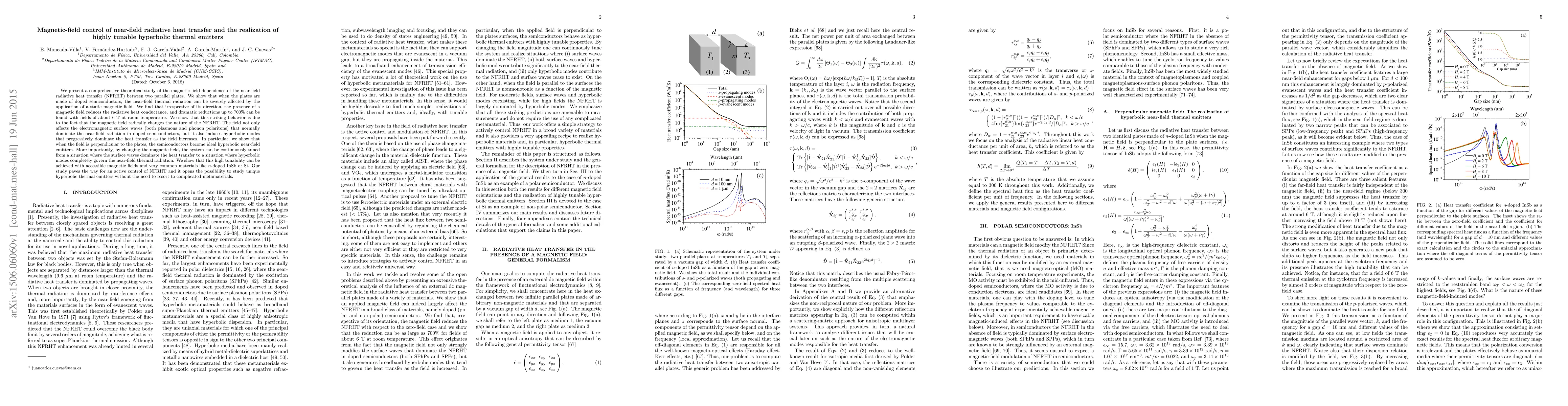 We present a comprehensive theoretical study of the magnetic field dependence of the near-field radiative heat transfer (NFRHT) between two parallel plates. We show that when the plates are made of doped semiconductors, the near-field thermal radiation can be severely affected by the application of a static magnetic field. We find that irrespective of its direction, the presence of a magnetic field reduces the radiative heat conductance, and dramatic reductions up to 700% can be found with fields of about 6 T at room temperature. We show that this striking behavior is due to the fact that the magnetic field radically changes the nature of the NFRHT. The field not only affects the electromagnetic surface waves (both plasmons and phonon polaritons) that normally dominate the near-field radiation in doped semiconductors, but it also induces hyperbolic modes that progressively dominate the heat transfer as the field increases. In particular, we show that when the field is perpendicular to the plates, the semiconductors become ideal hyperbolic near-field emitters. More importantly, by changing the magnetic field, the system can be continuously tuned from a situation where the surface waves dominate the heat transfer to a situation where hyperbolic modes completely govern the near-field thermal radiation. We show that this high tunability can be achieved with accessible magnetic fields and very common materials like n-doped InSb or Si. Our study paves the way for an active control of NFRHT and it opens the possibility to study unique hyperbolic thermal emitters without the need to resort to complicated metamaterials.