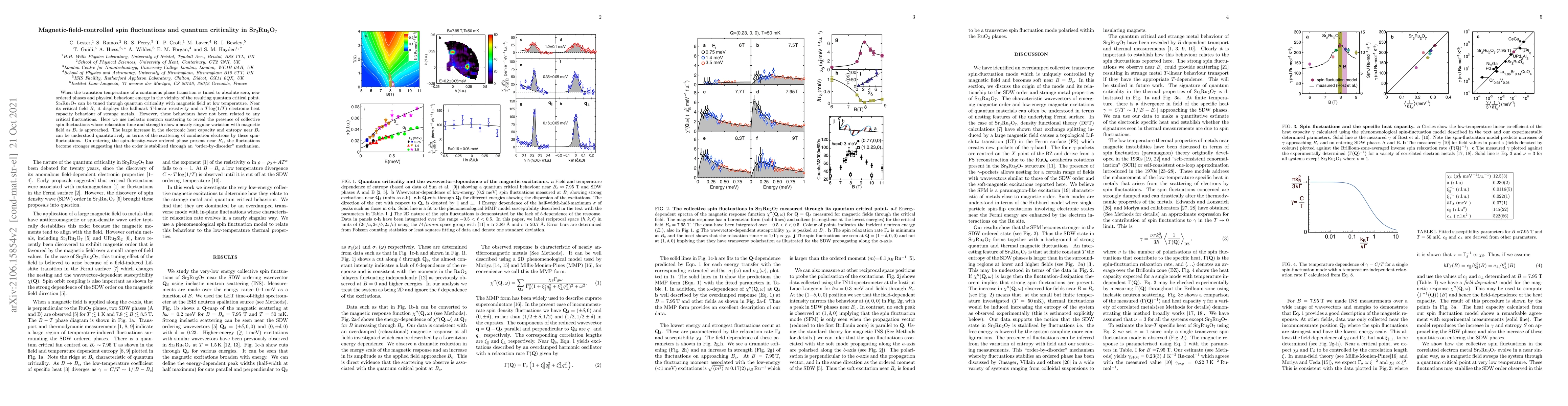 When the transition temperature of a continuous phase transition is tuned to absolute zero, new ordered phases and physical behaviour emerge in the vicinity of the resulting quantum critical point. Sr3Ru2O7 can be tuned through quantum criticality with magnetic field at low temperature. Near its critical field Bc it displays the hallmark T-linear resistivity and a T log(1/T) electronic heat capacity behaviour of strange metals. However, these behaviours have not been related to any critical fluctuations. Here we use inelastic neutron scattering to reveal the presence of collective spin fluctuations whose relaxation time and strength show a nearly singular variation with magnetic field as Bc is approached. The large increase in the electronic heat capacity and entropy near Bc can be understood quantitatively in terms of the scattering of conduction electrons by these spin-fluctuations. On entering the spin density wave (SDW) phase present near Bc, the fluctuations become stronger suggesting that the SDW order is stabilised through an "order-by-disorder" mechanism.