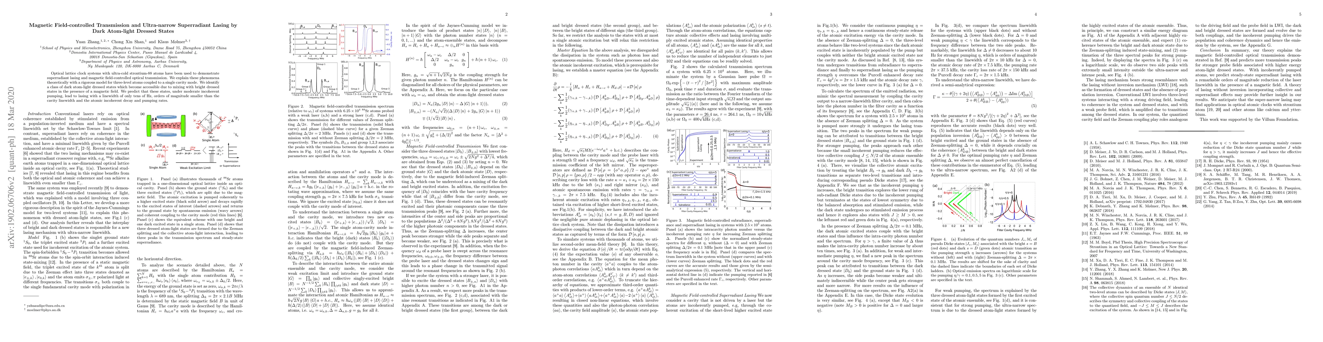 This paper demonstrates superradiant lasing and magnetic field-controlled optical transmission in optical lattice clock systems using ultra-cold strontium-88 atoms. The authors theoretically explain these phenomena using a model for three-level atoms coupled to a cavity, identifying dark atom-light dressed states that enable ultra-narrow superradiant lasing with a linewidth of tens of Hz.