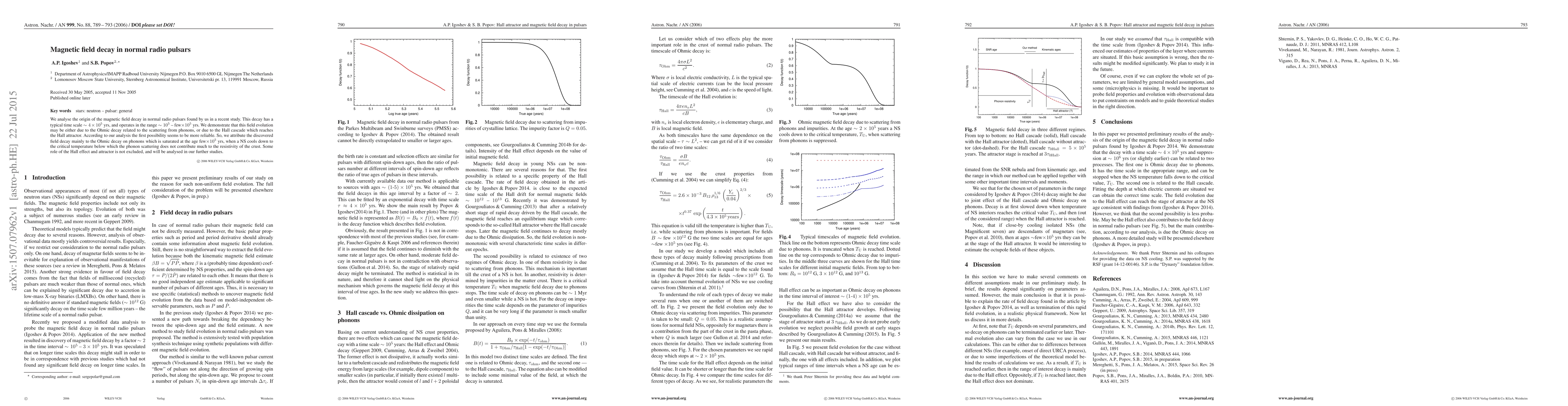 The research investigates the cause of magnetic field decay in normal radio pulsars, identifying Ohmic decay due to phonon scattering as the likely mechanism, operating on a timescale of a few times $10^5$ years, while acknowledging potential roles for the Hall effect and attractor, to be explored in future studies.