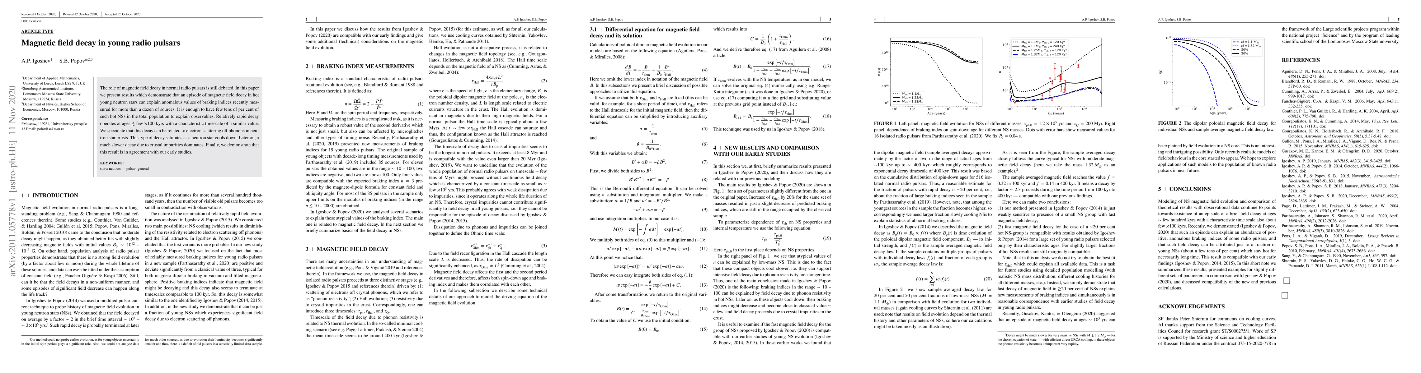 The role of magnetic field decay in normal radio pulsars is still debated. In this paper we present results which demonstrate that an episode of magnetic field decay in hot young neutron stars can explain anomalous values of braking indices recently measured for more than a dozen of sources. It is enough to have few tens of per cent of such hot NSs in the total population to explain observables. Relatively rapid decay operates at ages $\lesssim$~few~$\times100$~kyrs with a characteristic timescale of a similar value. We speculate that this decay can be related to electron scattering off phonons in neutron star crusts. This type of decay saturates as a neutron star cools down. Later on, a much slower decay due to crustal impurities dominates. Finally, we demonstrate that this result is in agreement with our early studies.