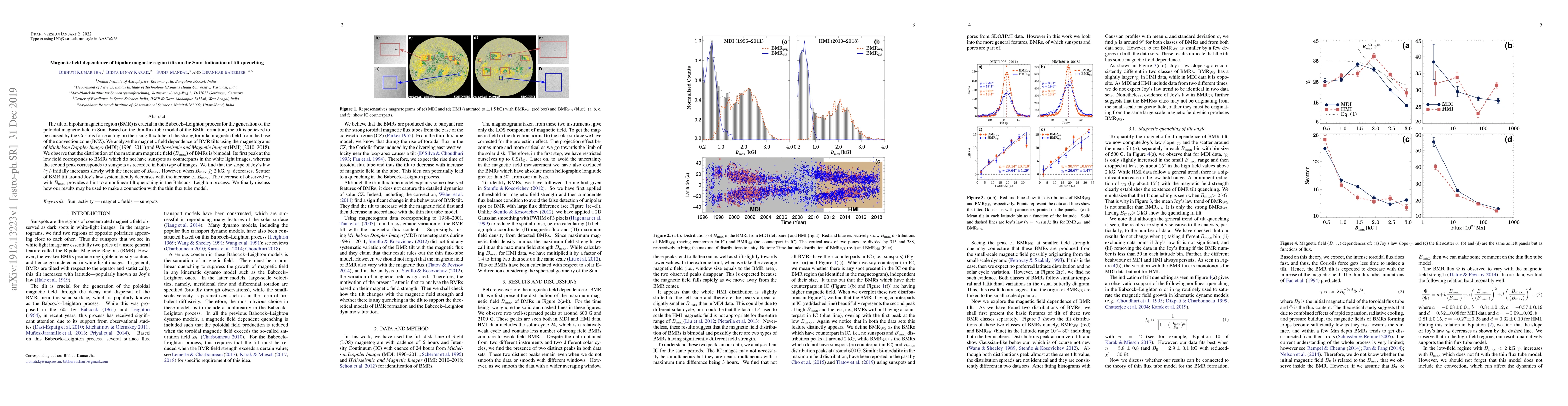 The tilt of bipolar magnetic region (BMR) is crucial in the Babcock--Leighton process for the generation of the poloidal magnetic field in Sun. Based on the thin flux tube model of the BMR formation, the tilt is believed to be caused by the Coriolis force acting on the rising flux tube of the strong toroidal magnetic field from the base of the convection zone (BCZ). We analyze the magnetic field dependence of BMR tilts using the magnetograms of Michelson Doppler Imager (MDI) (1996-2011) and Helioseismic and Magnetic Imager (HMI) (2010-2018). We observe that the distribution of the maximum magnetic field ($B_{\rm max}$) of BMRs is bimodal. Its first peak at the low field corresponds to BMRs which do not have sunspots as counterparts in the white light images, whereas the second peak corresponds to sunspots as recorded in both types of images. We find that the slope of Joy's law ($\gamma_0$) initially increases slowly with the increase of $B_{\rm max}$. However, when $B_{\rm max} \gtrsim 2$ kG, $\gamma_0$ decreases. Scatter of BMR tilt around Joy's law systematically decreases with the increase of $B_{\rm max}$. The decrease of observed $\gamma_0$ with $B_{\rm max}$ provides a hint to a nonlinear tilt quenching in the Babcock--Leighton process. We finally discuss how our results may be used to make a connection with the thin flux tube model.