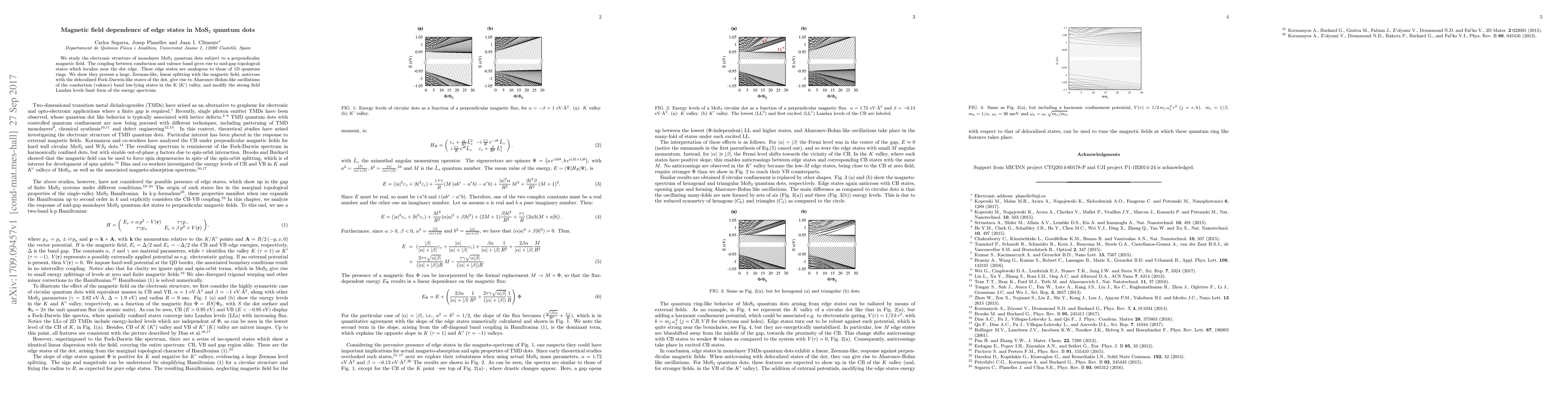 We study the electronic structure of monolayer MoS$_2$ quantum dots subject to a perpendicular magnetic field. The coupling between conduction and valence band gives rise to mid-gap topological states which localize near the dot edge. These edge states are analogous to those of 1D quantum rings. We show they present a large, Zeeman-like, linear splitting with the magnetic field, anticross with the delocalized Fock-Darwin-like states of the dot, give rise to Aharonov-Bohm-like oscillations of the conduction (valence) band low-lying states in the K (K') valley, and modify the strong field Landau levels limit form of the energy spectrum.