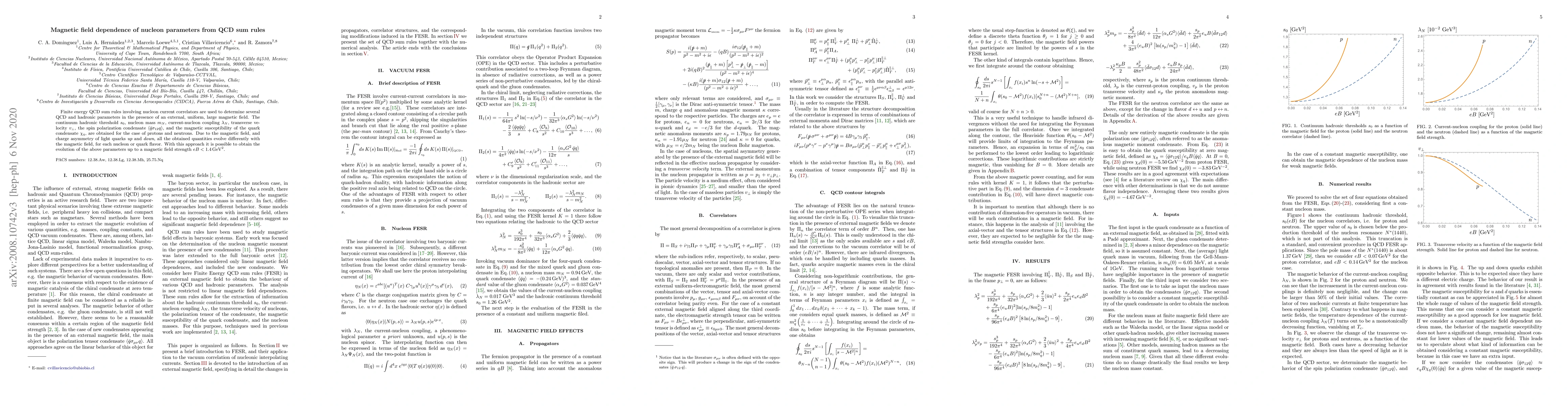 Finite energy QCD sum rules involving nucleon current correlators are used to determine several QCD and hadronic parameters in the presence of an external, uniform, large magnetic field. The continuum hadronic threshold $s_0$, nucleon mass $m_N$, current-nucleon coupling $\lambda_N$, transverse velocity $v_\perp$, the spin polarization condensate $\langle\bar q\sigma_{12} q\rangle$, and the magnetic susceptibility of the quark condensate $\chi_q$, are obtained for the case of protons and neutrons. Due to the magnetic field, and charge asymmetry of light quarks up and down, all the obtained quantities evolve differently with the magnetic field, for each nucleon or quark flavor. With this approach it is possible to obtain the evolution of the above parameters up to a magnetic field strength $eB < 1.4$ GeV$^2$.