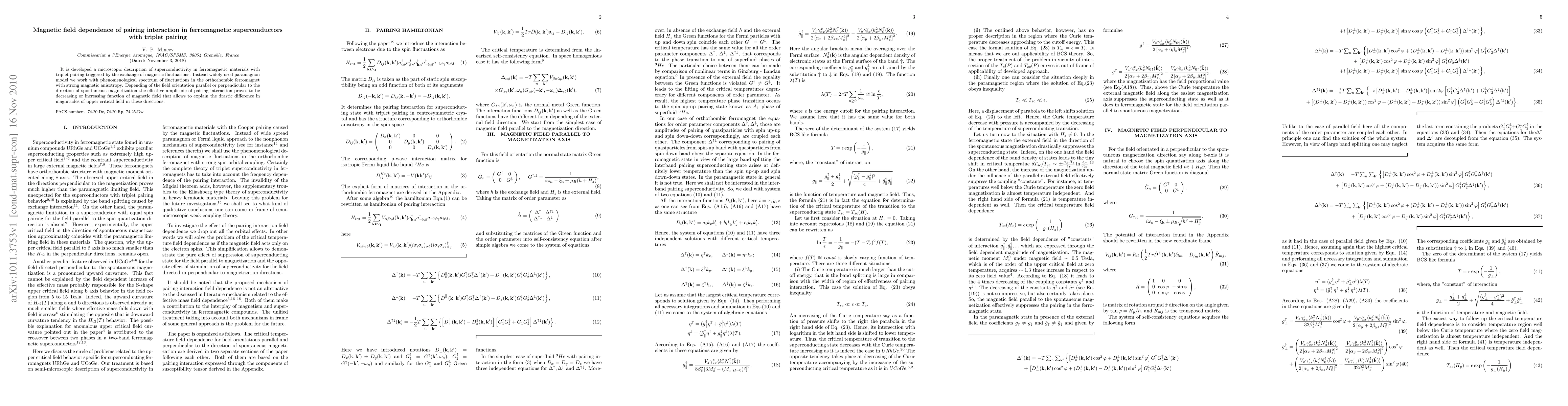 This paper provides a microscopic model for superconductivity in ferromagnetic materials with triplet pairing, showing that the effective pairing interaction varies with magnetic field orientation relative to the spontaneous magnetization, explaining differences in upper critical field magnitudes.