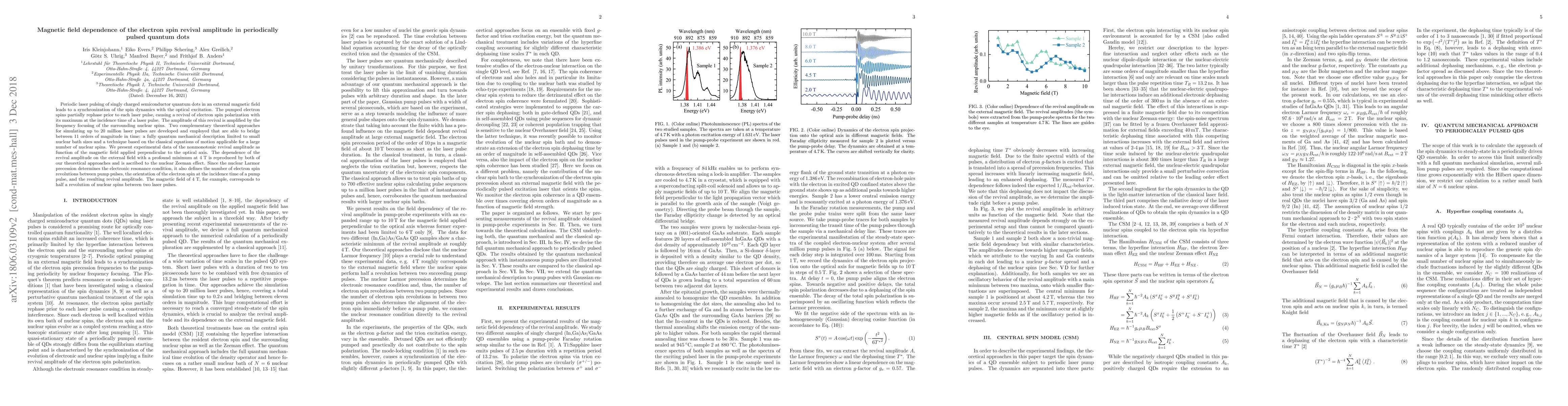 This paper investigates the electron spin revival in periodically pulsed quantum dots under an external magnetic field, showing that the revival amplitude is amplified by nuclear spin interactions. Both theoretical and experimental results reveal a profound minimum in the revival amplitude at 4 T, attributed to the nuclear Zeeman effect, which influences the electron spin dynamics.