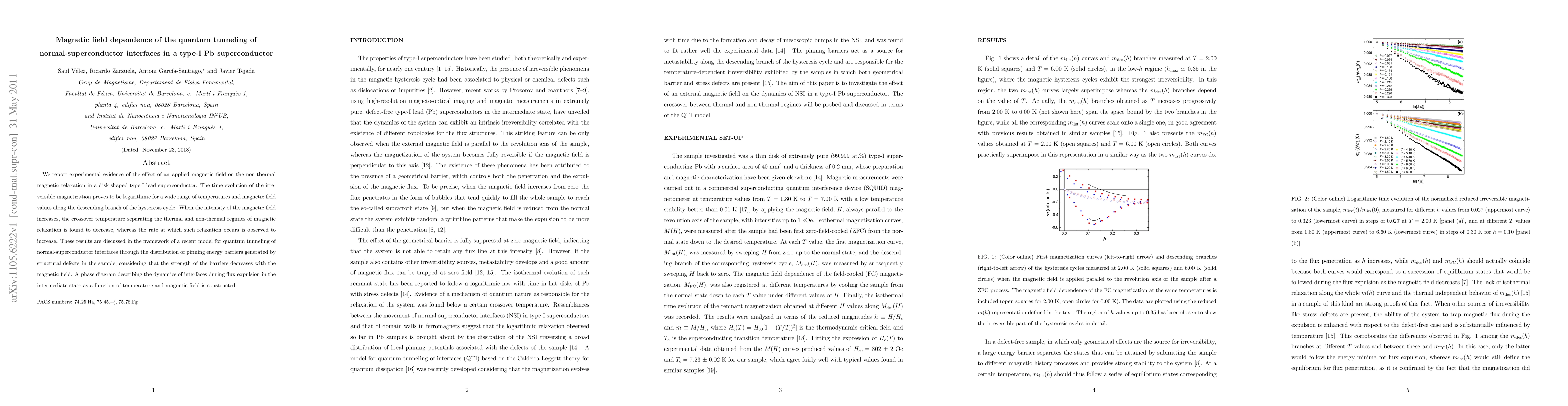 We report experimental evidence of the effect of an applied magnetic field on the non-thermal magnetic relaxation in a disk-shaped type-I lead superconductor. The time evolution of the irreversible magnetization proves to be logarithmic for a wide range of temperatures and magnetic field values along the descending branch of the hysteresis cycle. When the intensity of the magnetic field increases, the crossover temperature separating the thermal and non-thermal regimes of magnetic relaxation is found to decrease, whereas the rate at which such relaxation occurs is observed to increase. These results are discussed in the framework of a recent model for quantum tunneling of normal-superconductor interfaces through the distribution of pinning energy barriers generated by structural defects in the sample, considering that the strength of the barriers decreases with the magnetic field. A phase diagram describing the dynamics of interfaces during flux expulsion in the intermediate state as a function of temperature and magnetic field is constructed.