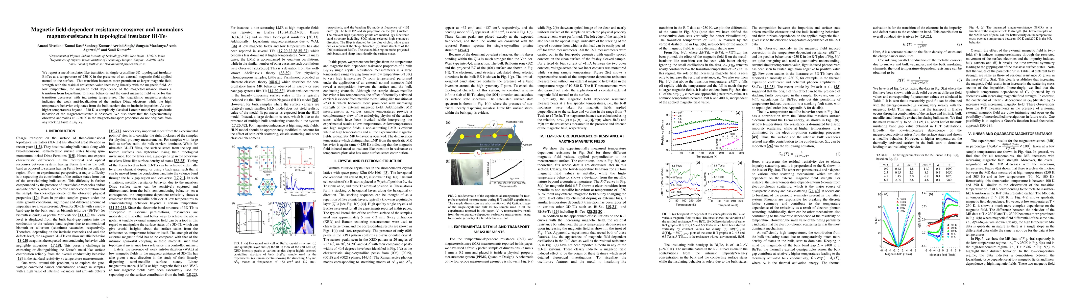 We report a metal-insulator like transition in single crystalline 3D topological insulator Bi2Te3 at a temperature of 230K in presence of an external magnetic field applied normal to the surface. This transition becomes more prominent at larger magnetic field strength with the residual resistance value increasing linearly with the magnetic field. At low temperature, the magnetic field dependence of the magnetoresistance shows a transition from logarithmic to linear behavior and the onset magnetic field value for this transition decreases with increasing temperature. The logarithmic magnetoresistance indicates the weak anti-localization of the surface Dirac electrons while the high temperature behavior originates from the bulk carriers due to intrinsic impurities. At even higher temperatures beyond~230 K, a completely classical Lorentz model type quadratic behavior of the magnetoresistance is observed. We also show that the experimentally observed anomalies at ~230K in the magneto-transport properties do not originate from any stacking fault in Bi2Te3.