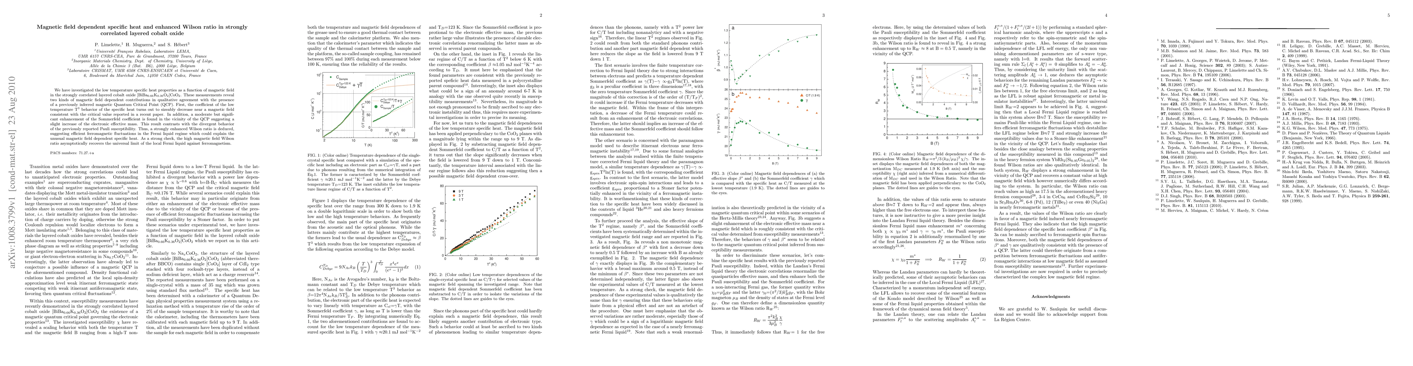 We have investigated the low temperature specific heat properties as a function of magnetic field in the strongly correlated layered cobalt oxide [BiBa$_{0.66}$K$_{0.36}$O$_2$]CoO$_2$. These measurements reveal two kinds of magnetic field dependent contributions in qualitative agreement with the presence of a previously inferred magnetic Quantum Critical Point (QCP). First, the coefficient of the low temperature T$^3$ behavior of the specific heat turns out to sizeably decrease near a magnetic field consistent with the critical value reported in a recent paper. In addition, a moderate but significant enhancement of the Sommerfeld coefficient is found in the vicinity of the QCP suggesting a slight increase of the electronic effective mass. This result contrasts with the divergent behavior of the previously reported Pauli susceptibility. Thus, a strongly enhanced Wilson ratio is deduced, suggesting efficient ferromagnetic fluctuations in the Fermi liquid regime which could explain the unusual magnetic field dependent specific heat. As a strong check, the high magnetic field Wilson ratio asymptotically recovers the universal limit of the local Fermi liquid against ferromagnetism.