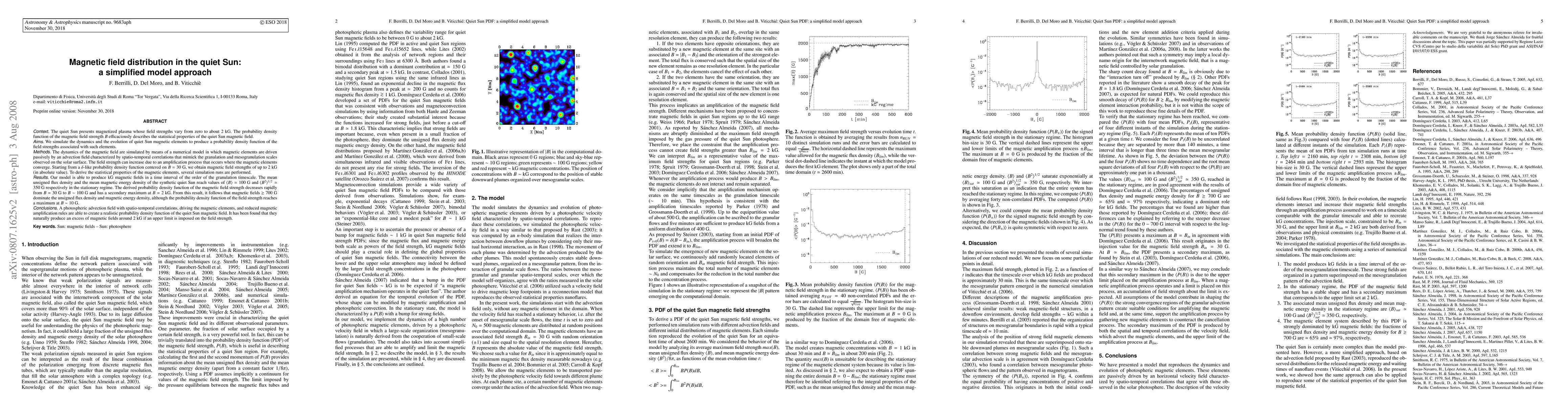 This paper presents a numerical model simulating the evolution of magnetic elements in the quiet Sun, showing that it can generate magnetic field strengths up to 2 kG, with a derived probability density function indicating that while fields around 30 G are most probable, those exceeding 700 G dominate the flux density and magnetic energy.