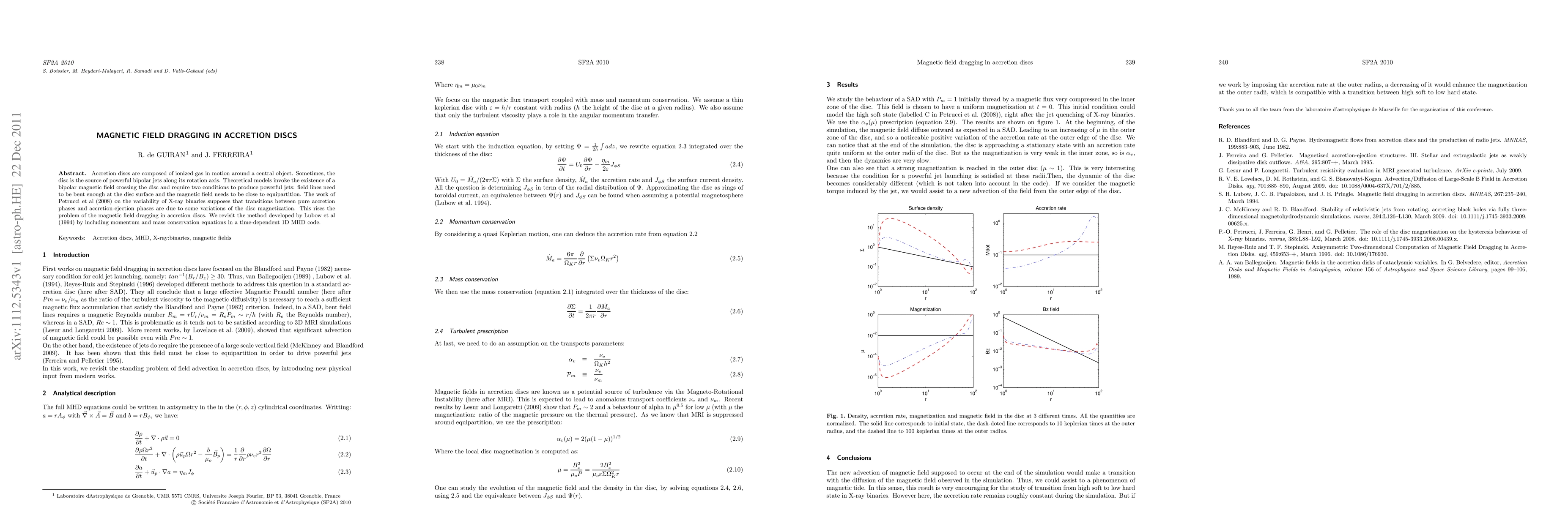 The research revisits the method developed by Lubow et al. (1994) by including momentum and mass conservation equations in a time-dependent 1D MHD code to study magnetic field dragging in accretion discs.