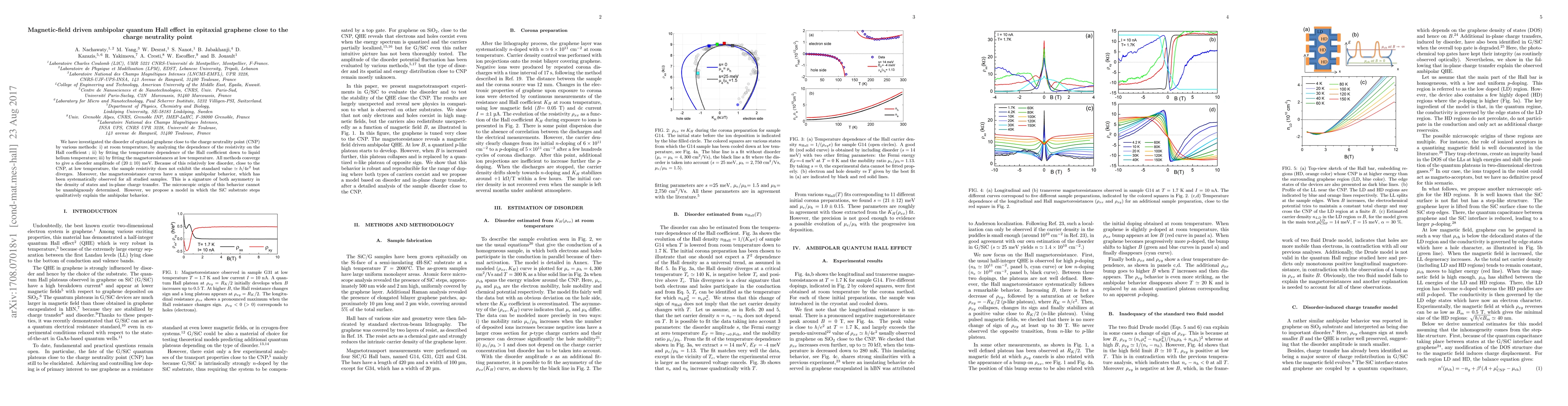 We have investigated the disorder of epitaxial graphene close to the charge neutrality point (CNP) by various methods: i) at room temperature, by analyzing the dependence of the resistivity on the Hall coefficient ; ii) by fitting the temperature dependence of the Hall coefficient down to liquid helium temperature; iii) by fitting the magnetoresistances at low temperature. All methods converge to give a disorder amplitude of $(20 \pm 10)$ meV. Because of this relatively low disorder, close to the CNP, at low temperature, the sample resistivity does not exhibit the standard value $\simeq h/4e^2$ but diverges. Moreover, the magnetoresistance curves have a unique ambipolar behavior, which has been systematically observed for all studied samples. This is a signature of both asymmetry in the density of states and in-plane charge transfer. The microscopic origin of this behavior cannot be unambiguously determined. However, we propose a model in which the SiC substrate steps qualitatively explain the ambipolar behavior.