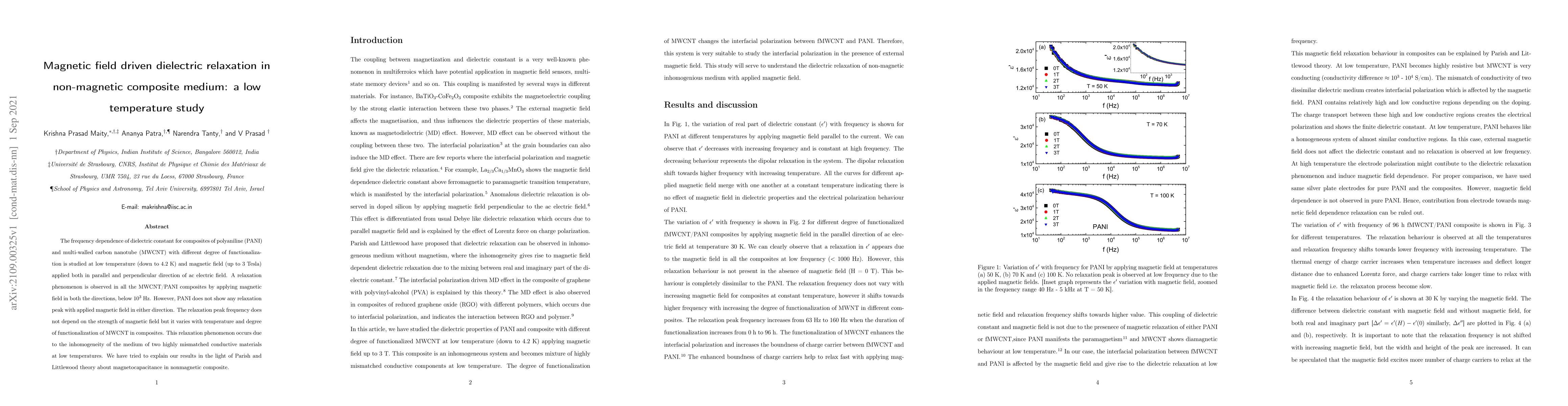The frequency dependence of dielectric constant for composites of polyaniline (PANI) and multi-walled carbon nanotube (MWCNT) with different degree of functionalization is studied at low temperature (down to 4.2 K) and magnetic field (up to 3 Tesla) applied both in parallel and perpendicular direction of ac electric field. A relaxation phenomenon is observed in all the MWCNT/PANI composites by applying magnetic field in both the directions, below 10$^3$ Hz. However, PANI does not show any relaxation peak with applied magnetic field in either direction. The relaxation peak frequency does not depend on the strength of magnetic field but it varies with temperature and degree of functionalization of MWCNT in composites. This relaxation phenomenon occurs due to the inhomogeneity of the medium of two highly mismatched conductive materials at low temperatures. We have tried to explain our results in the light of Parish and Littlewood theory about magnetocapacitance in nonmagnetic composite.