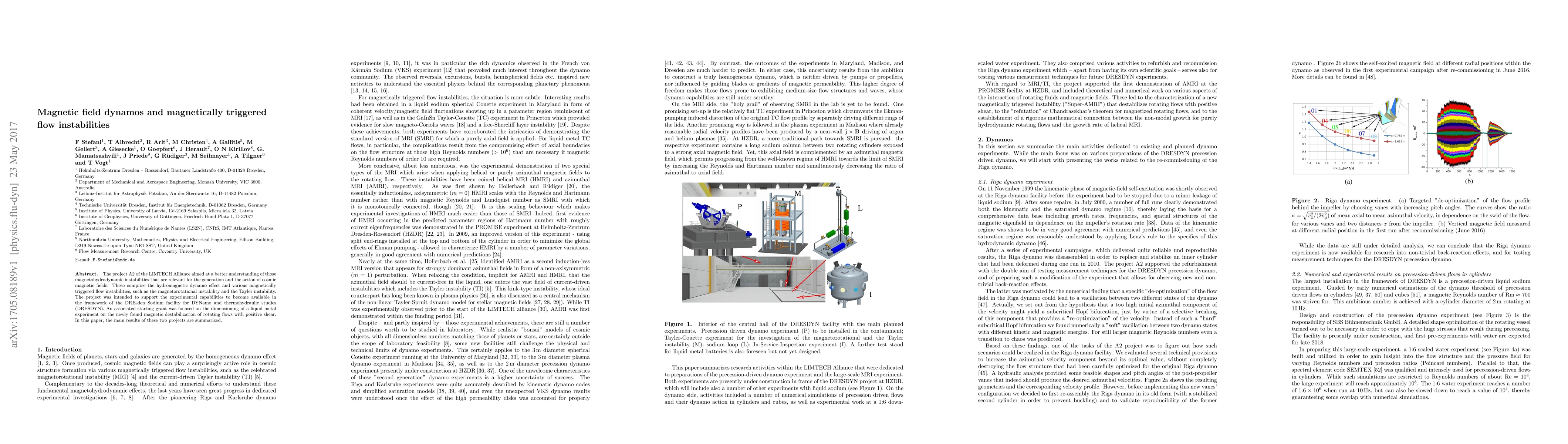 The project A2 of the LIMTECH Alliance aimed at a better understanding of those magnetohydrodynamic instabilities that are relevant for the generation and the action of cosmic magnetic fields. These comprise the hydromagnetic dynamo effect and various magnetically triggered flow instabilities, such as the magnetorotational instability and the Tayler instability. The project was intended to support the experimental capabilities to become available in the framework of the DREsden Sodium facility for DYNamo and thermohydraulic studies (DRESDYN). An associated starting grant was focused on the dimensioning of a liquid metal experiment on the newly found magnetic destabilization of rotating flows with positive shear. In this paper, the main results of these two projects are summarized.