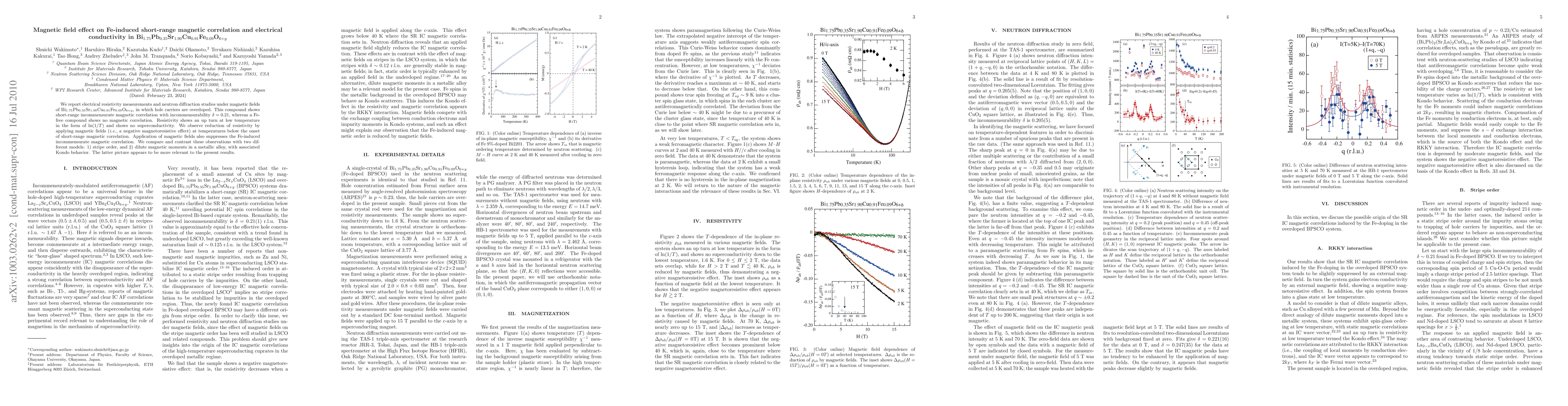 We report electrical resistivity measurements and neutron diffraction studies under magnetic fields of Bi$_{1.75}$Pb$_{0.35}$Sr$_{1.90}$Cu$_{0.91}$Fe$_{0.09}$O$_{6+y}$, in which hole carriers are overdoped. This compound shows short-range incommensurate magnetic correlation with incommensurability $\delta=0.21$, whereas a Fe-free compound shows no magnetic correlation. Resistivity shows an up turn at low temperature in the form of $ln(1/T)$ and shows no superconductivity. We observe reduction of resistivity by applying magnetic fields (i.e., a negative magnetoresistive effect) at temperatures below the onset of short-range magnetic correlation. Application of magnetic fields also suppresses the Fe induced incommensurate magnetic correlation. We compare and contrast these observations with two different models: 1) stripe order, and 2) dilute magnetic moments in a metallic alloy, with associated Kondo behavior. The latter picture appears to be more relevant to the present results.