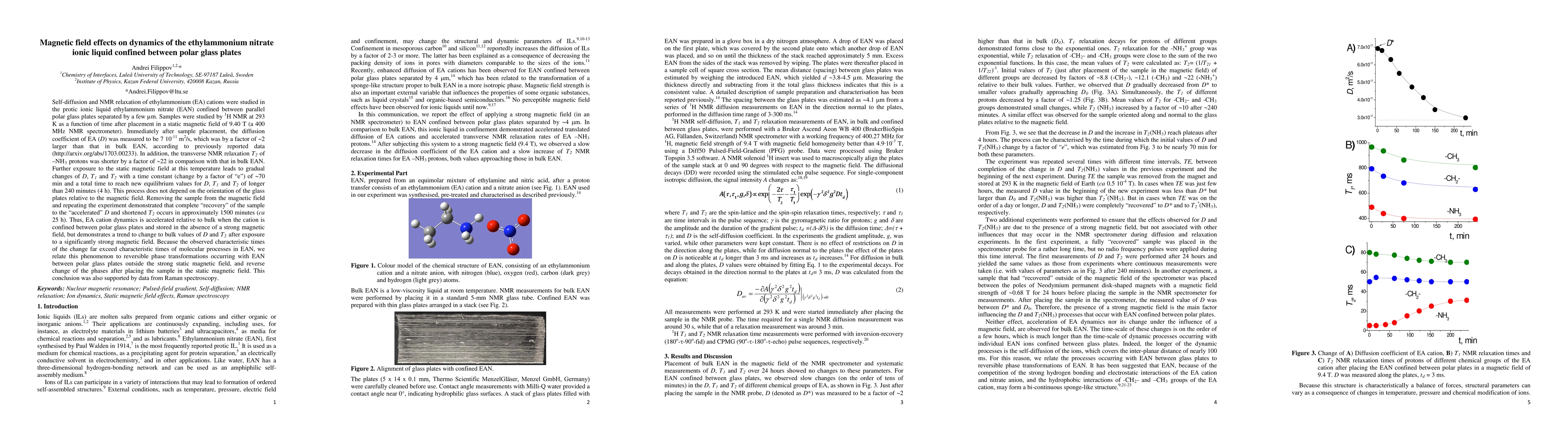 Self-diffusion and NMR relaxation of ethylammonium (EA) cations were studied in the protic ionic liquid ethylammonium nitrate (EAN) confined between parallel polar glass plates separated by a few um as a function of time after placement in a magnetic field of 9.40 T. Immediately after sample placement, the diffusion coefficient of EA (D) increased by a factor of 2, while the transverse NMR relaxation of NH3 protons decreased by factors of up to 22 in comparison with bulk EAN, according to previously published data. Further exposure to the magnetic field leads to gradual changes of D, T1 and T2 with a time constant of 70 min and a total equilibration time of longer than 4 hours. This process does not depend on the orientation of the glass plates relative to the magnetic field. Removing the sample from the magnetic field and repeating the experiment demonstrated that complete recovery of the sample to the accelerated D and shortened T2 occurs in approximately 24 hours. Thus, EA cation dynamics is accelerated relative to bulk when the cation is confined between polar glass plates and stored in the absence of a strong magnetic field, but demonstrate a trend to change to bulk values of D and T2 after exposure to a magnetic field. Because the observed characteristic times of the change far exceed molecular process times in EAN, we relate this phenomenon to reversible phase transformations occurring with EAN between polar plates outside the strong magnetic field, and reverse change of the phases after placing the sample in the magnetic field. This conclusion was confirmed by data of Raman spectroscopy.
