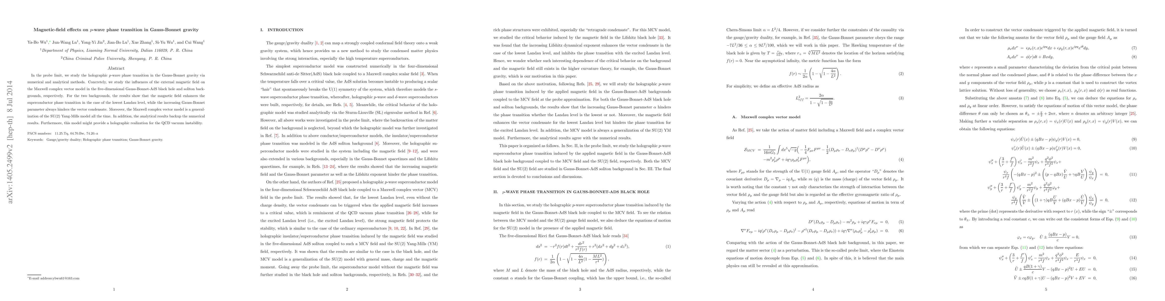 In the probe limit, we study the holographic $p$-wave phase transition in the Gauss-Bonnet gravity via numerical and analytical methods. Concretely, we study the influences of the external magnetic field on the Maxwell complex vector model in the five-dimensional Gauss-Bonnet-AdS black hole and soliton backgrounds, respectively. For the two backgrounds, the results show that the magnetic field enhances the superconductor phase transition in the case of the lowest Landau level, while the increasing Gauss-Bonnet parameter always hinders the vector condensate. Moreover, the Maxwell complex vector model is a generalization of the SU(2) Yang-Mills model all the time. In addition, the analytical results backup the numerical results. Furthermore, this model might provide a holographic realization for the QCD vacuum instability.