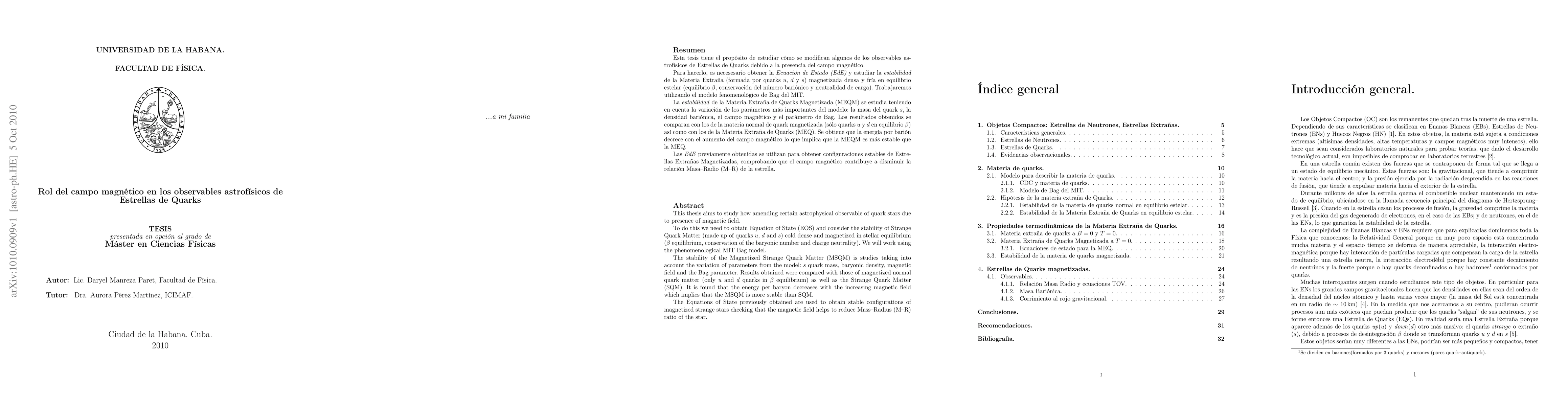 This thesis aims to study how amending certain astrophysical observable of quark stars due to presence of magnetic field. To do this we need to obtain Equation of State (EOS) and consider the stability of Strange Quark Matter (made up of quarks u, d and s) cold dense and magnetized in stellar equilibrium (beta equilibrium, conservation of the baryonic number and charge neutrality). We will work using the phenomenological MIT Bag model. The stability of the Magnetized Strange Quark Matter (MSQM) is studied taking into account the variation of parameters from the model: s quark mass, baryonic density, magnetic field and the Bag parameter. Results obtained were compared with those of magnetized normal quark matter (only u and d quarks in beta equilibrium) as well as the Strange Quark Matter (SQM). It is found that the energy per baryon decreases with the increasing magnetic field which implies that the MSQM is more stable than SQM. The Equations of State previously obtained are used to obtain stable configurations of magnetized strange stars checking that the magnetic field helps to reduce Mass-Radius (M-R) ratio of the star.